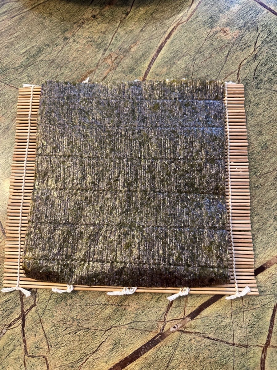 วางสาหร่ายโนริสำหรับทำซูชิลงบนเสื่อทำซูชิ โดยให้ด้านที่มันวาวกว่าคว่ำลง