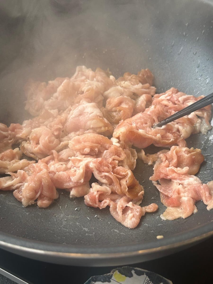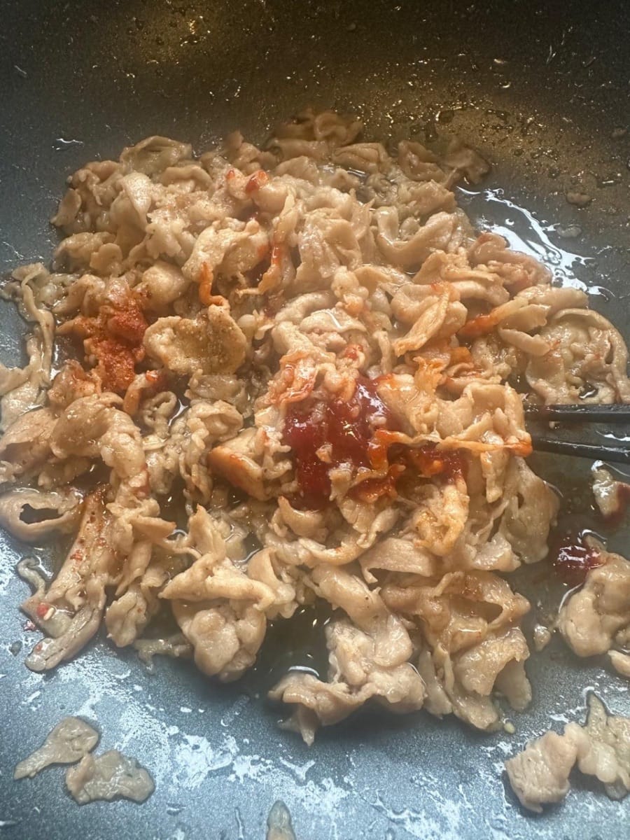 หลังจากนั้น นำเนื้อที่หั่นไว้ไปผัดในกระทะ แล้วใส่พริกป่นและโกชูจัง ตามด้วยน้ำตาล ซอสถั่วเหลือง พริกไทยขาว และเหล้าข้าว