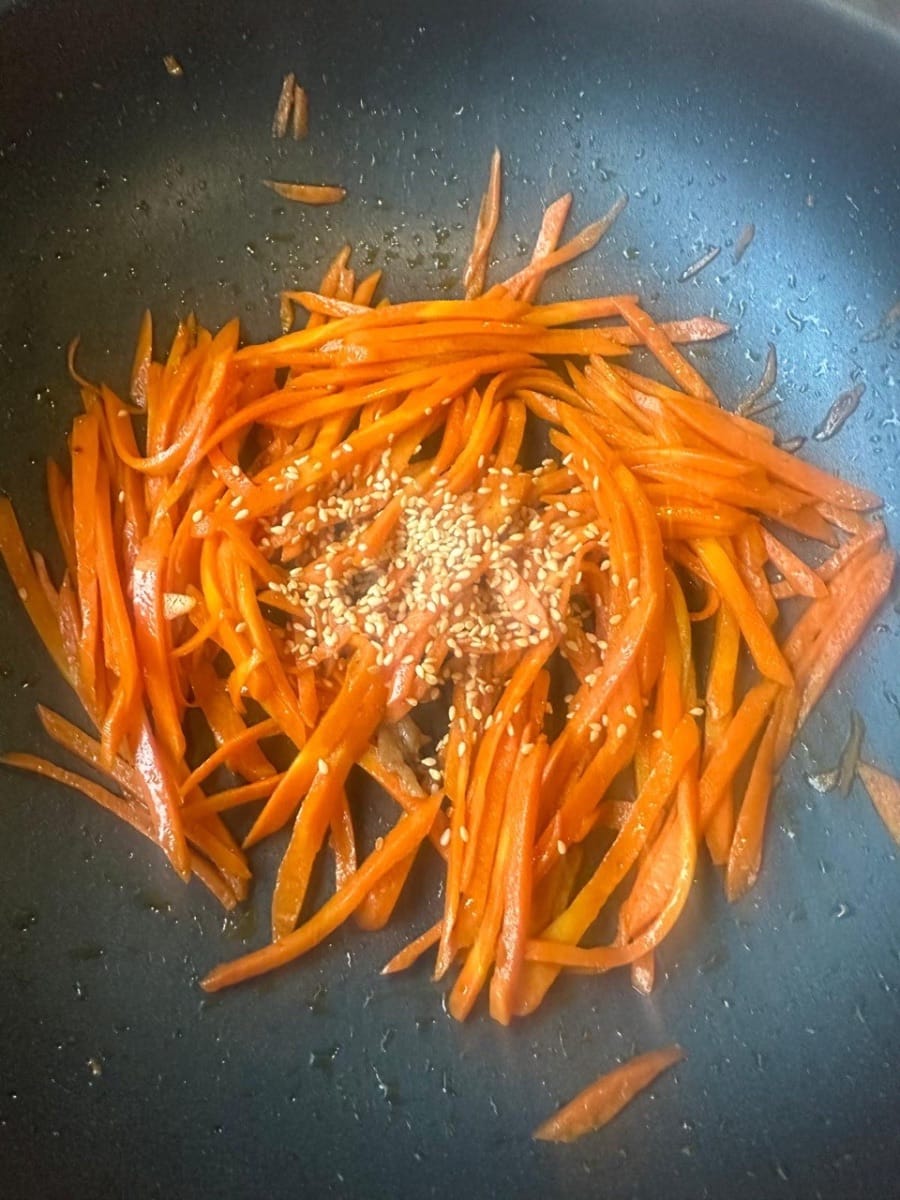 จากนั้น นำแครอทขูดฝอยไปผัดในกระทะด้วยน้ำมันงาดำและเกลือ