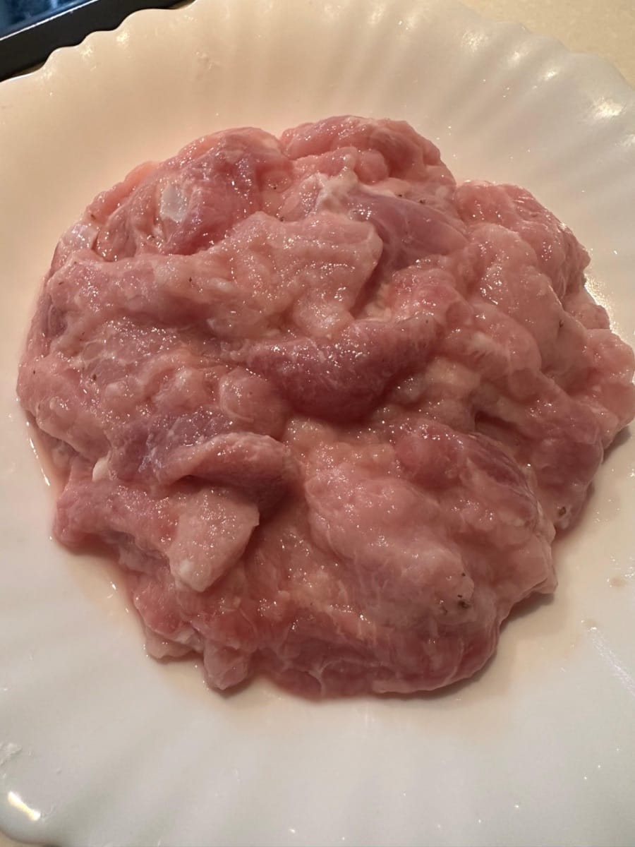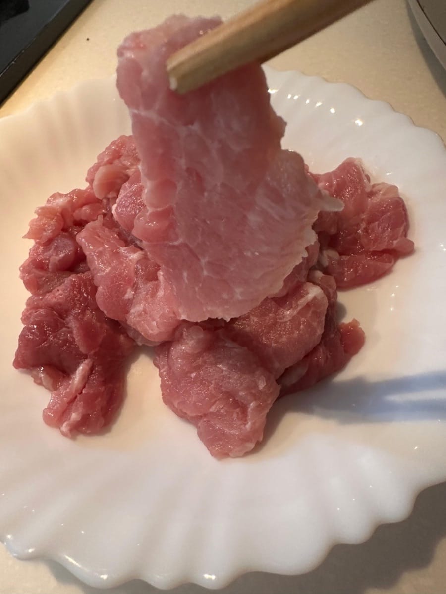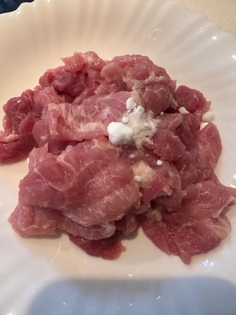 เริ่มจากหั่นเนื้อหมูเป็นชิ้นบางๆ