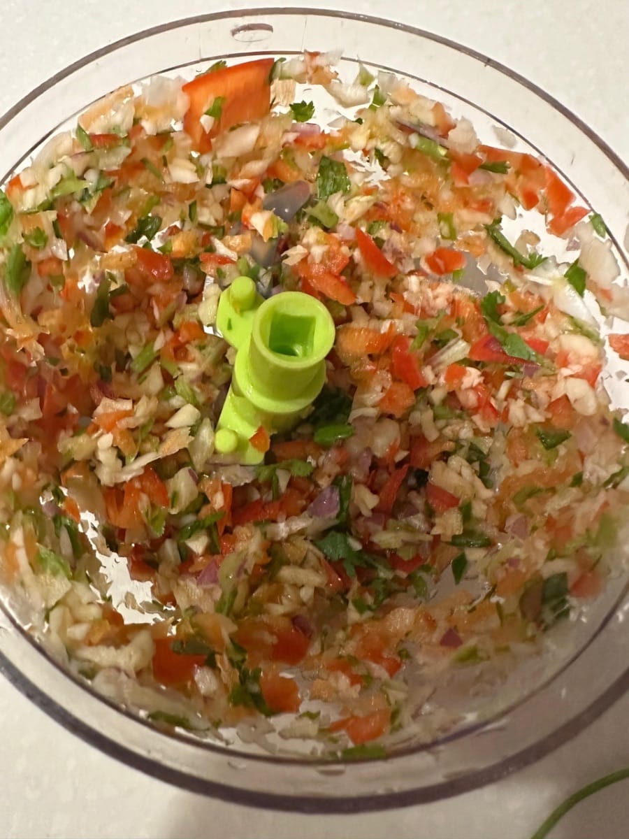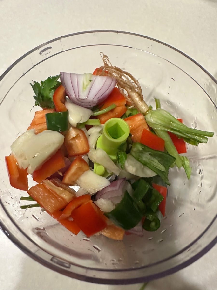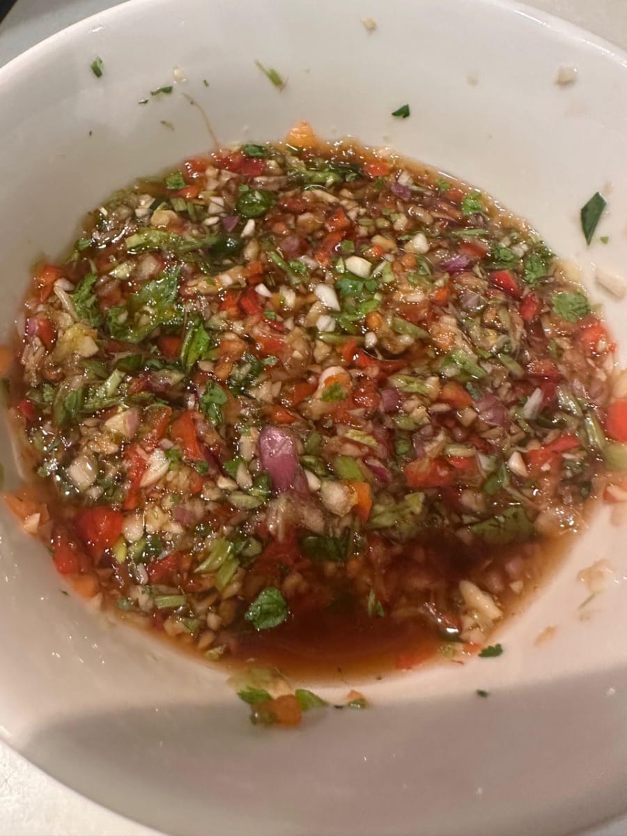 เตรียมส่วนผสมของซอสและปั่นให้เป็นชิ้นเล็กๆ จากนั้นเติมเครื่องปรุงรสที่เป็นของเหลวลงไปหลังจากปั่นเสร็จแล้ว