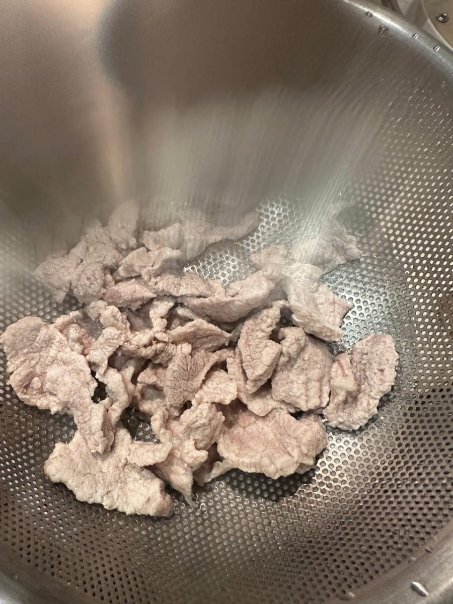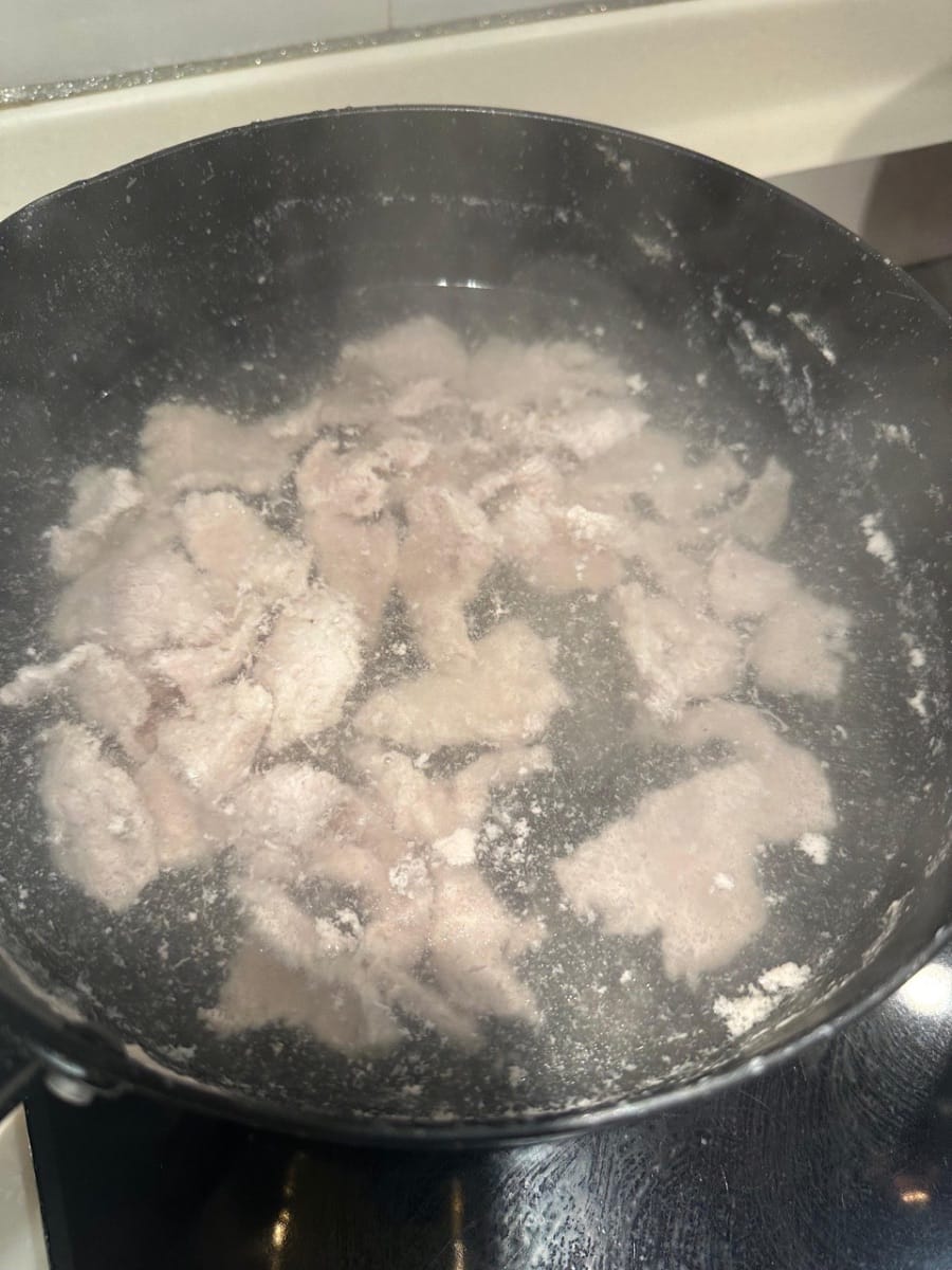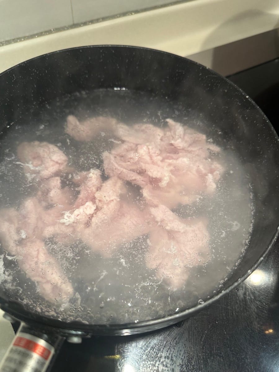 ในหม้อน้ำเดือดอีกใบหนึ่ง นำเนื้อไปต้มประมาณ 1.5-2 นาที หรือจนกว่าจะสุก