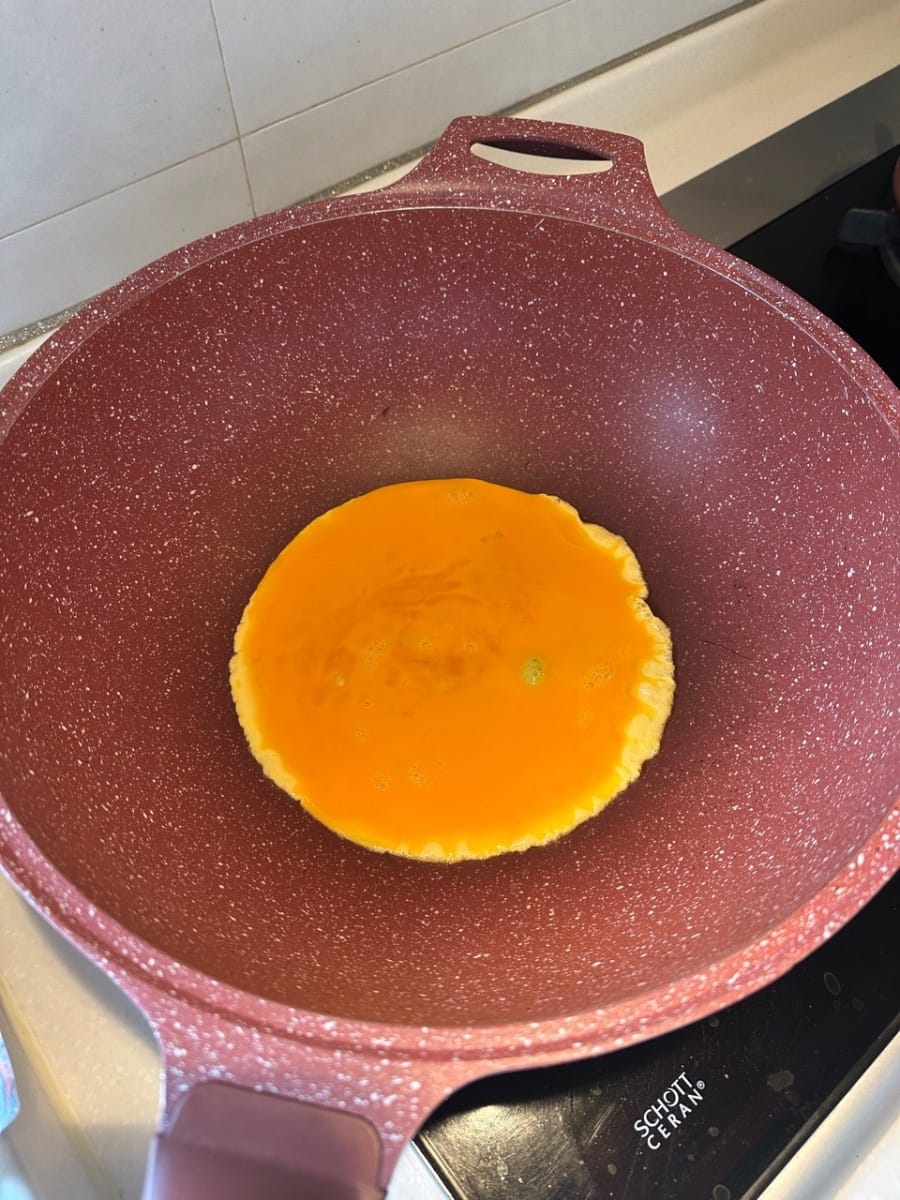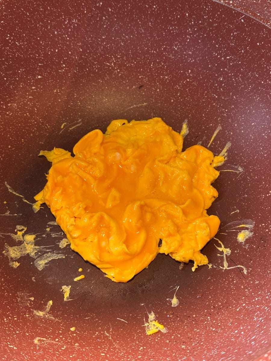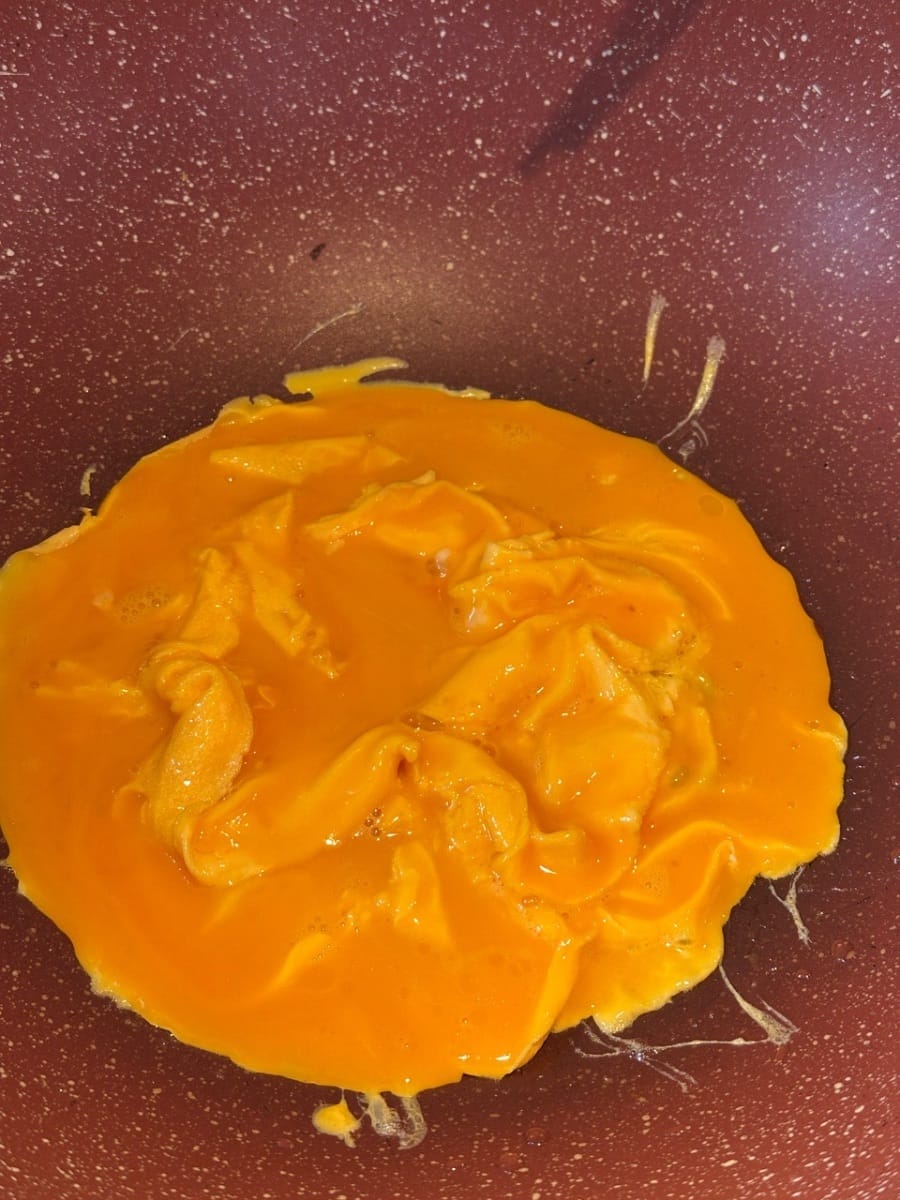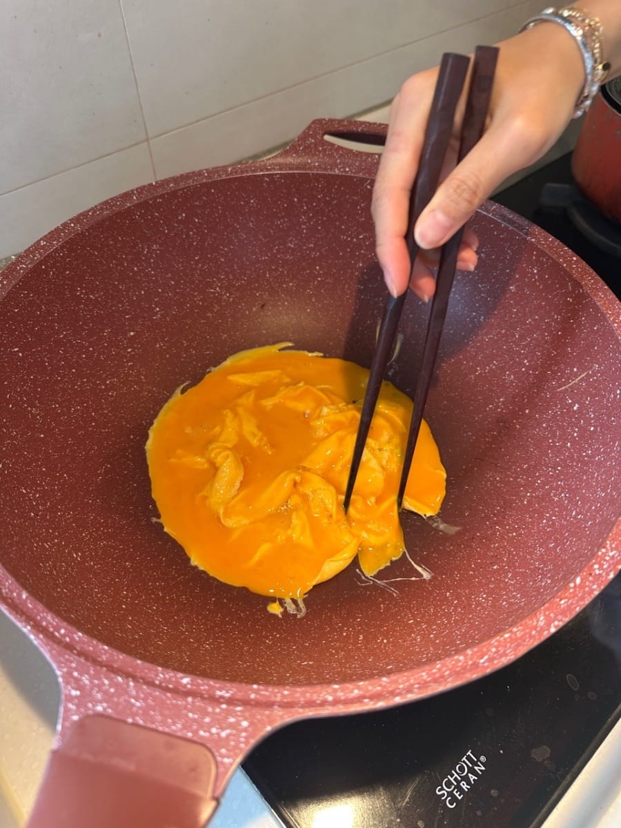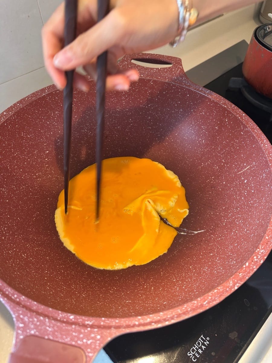 ตั้งกระทะใส่น้ำมันเล็กน้อย ใช้ไฟปานกลาง เทไข่ลงไป ทิ้งไว้สักสองสามวินาทีก่อนคนให้สุก