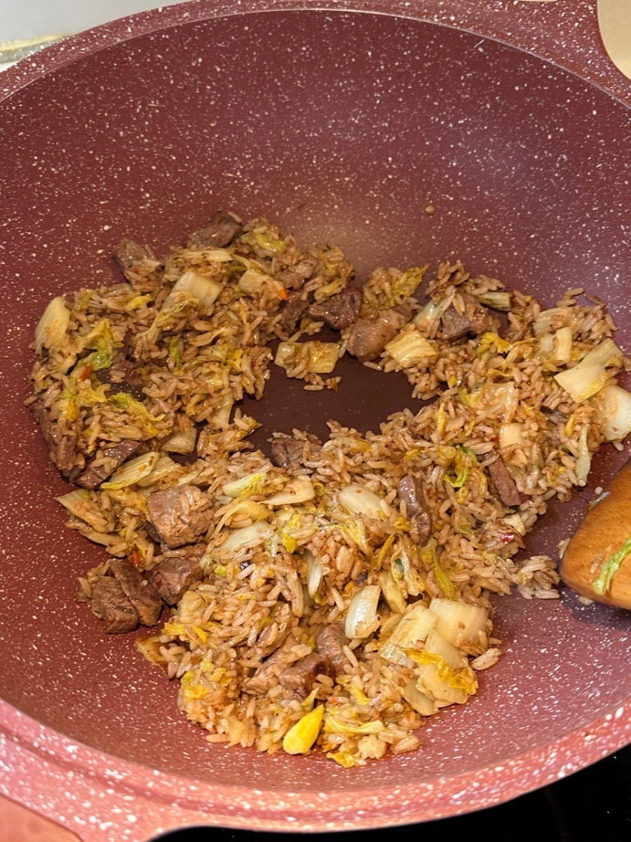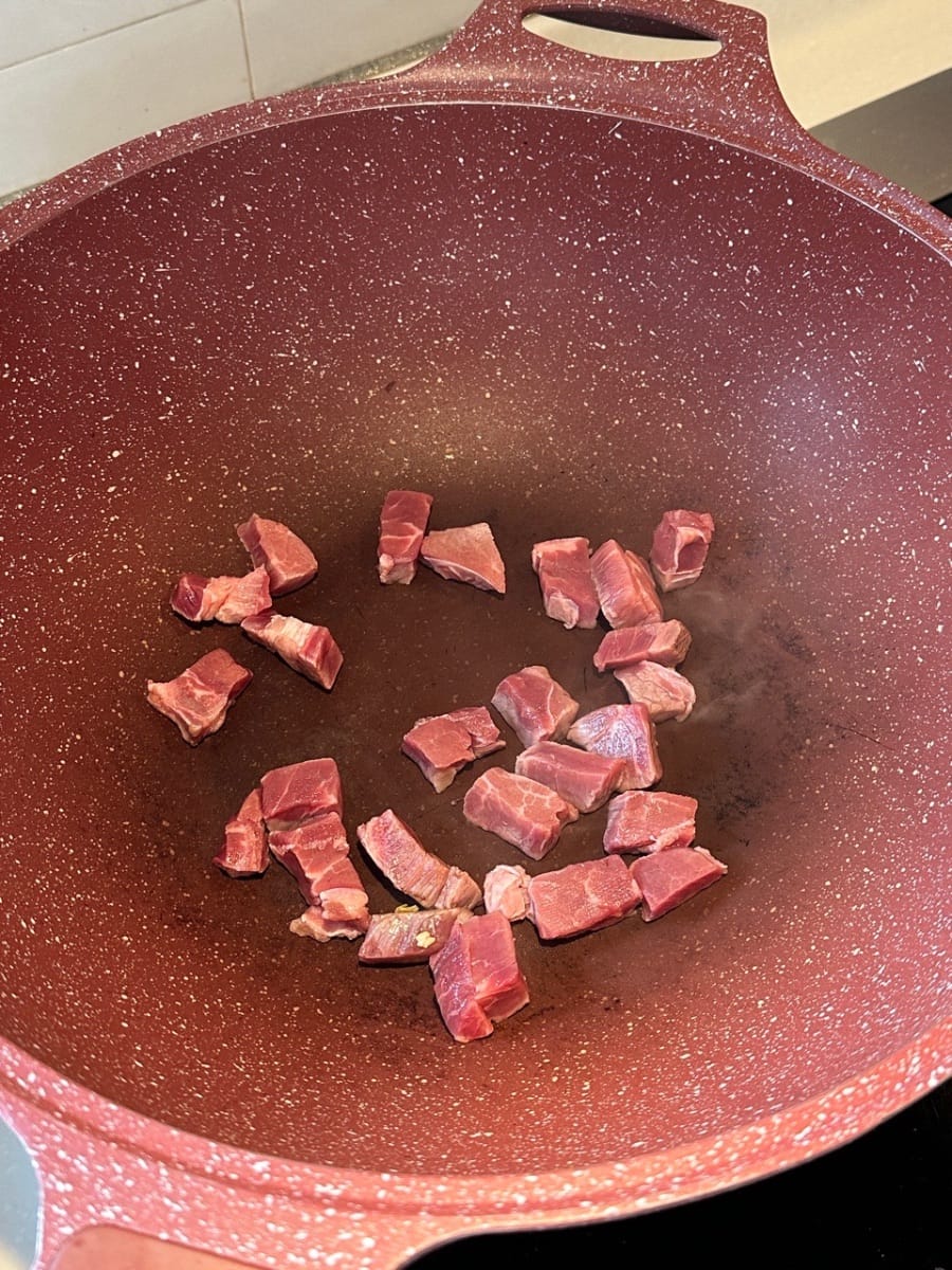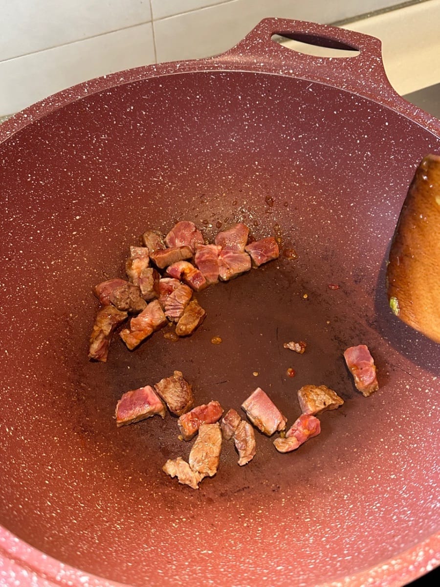 ใช้กระทะใบเดิม ทอดเนื้อสเต็กหั่นเต๋าจนสุก