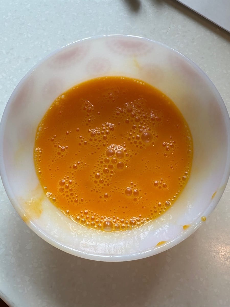 ใส่นมลงในไข่สองฟองแล้วตีให้เข้ากัน