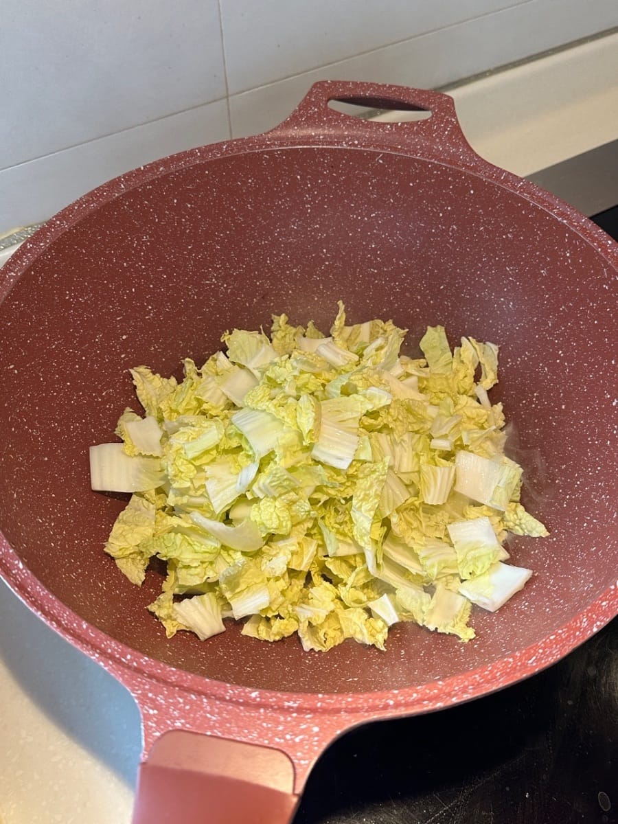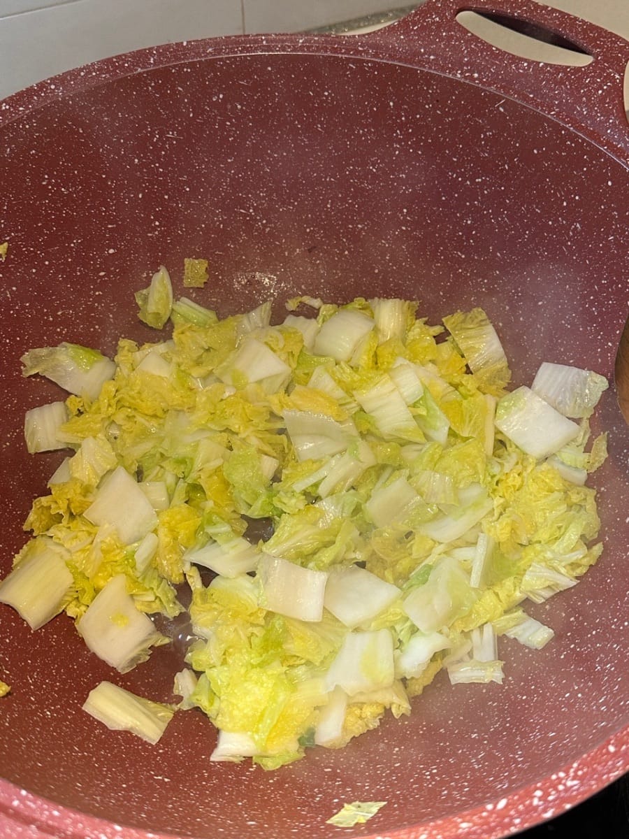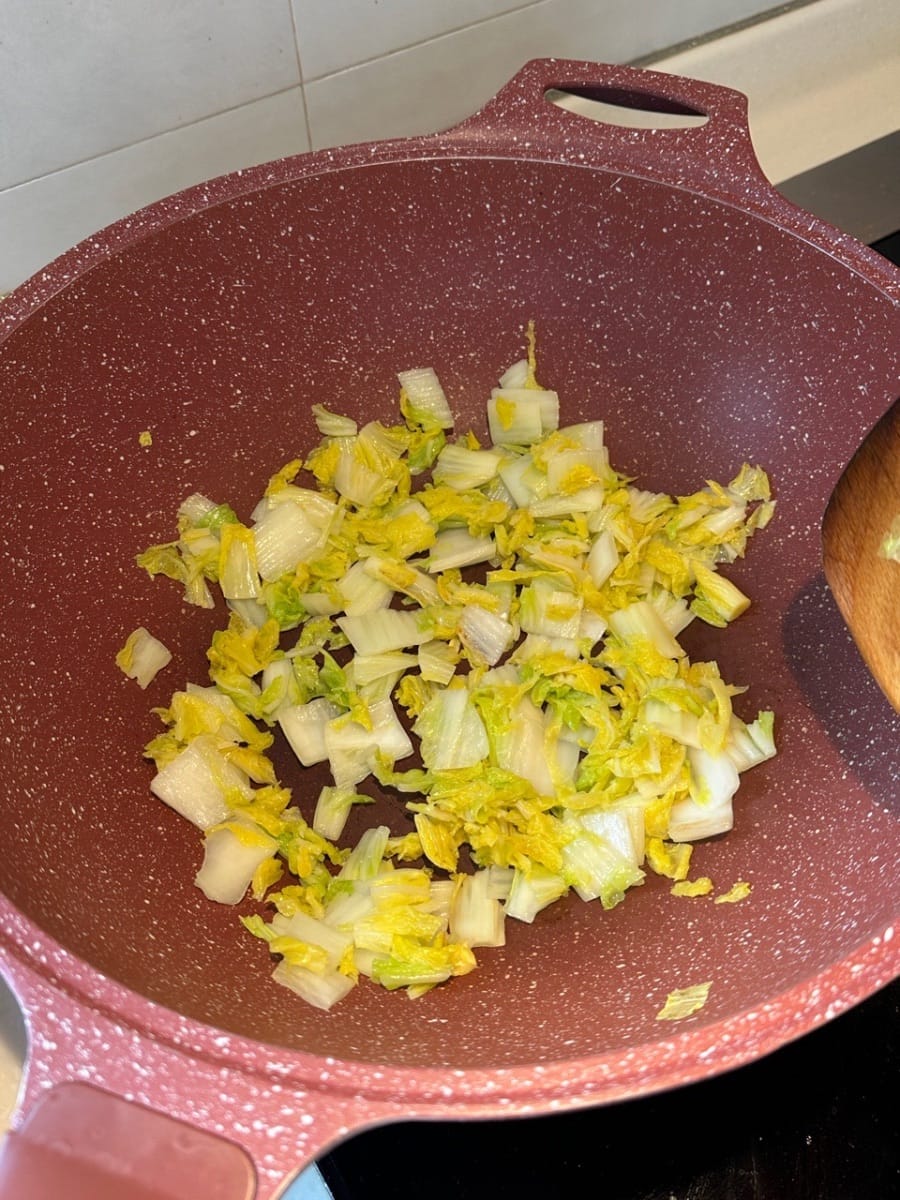 ตั้งกระทะให้ร้อน ใส่น้ำมันเล็กน้อย ผัดผักจนน้ำระเหยหมดและแห้งสนิท พักไว้ใช้ภายหลัง