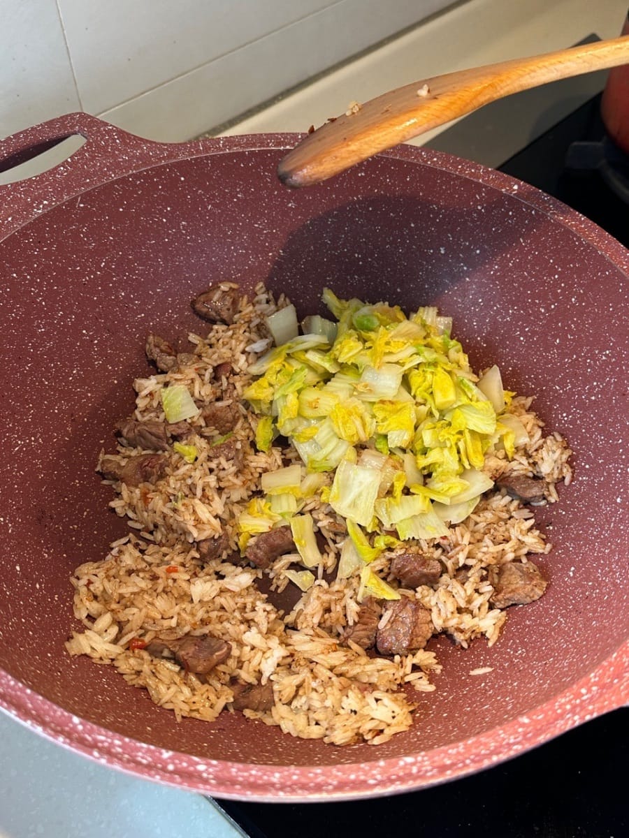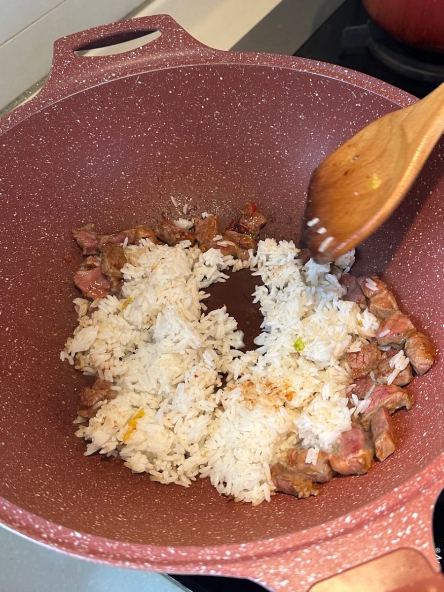ใส่ข้าว ซอสพริก XO ซอสถั่วเหลือง และซีอิ๊วดำลงไป ผัดต่อไปเรื่อยๆ
