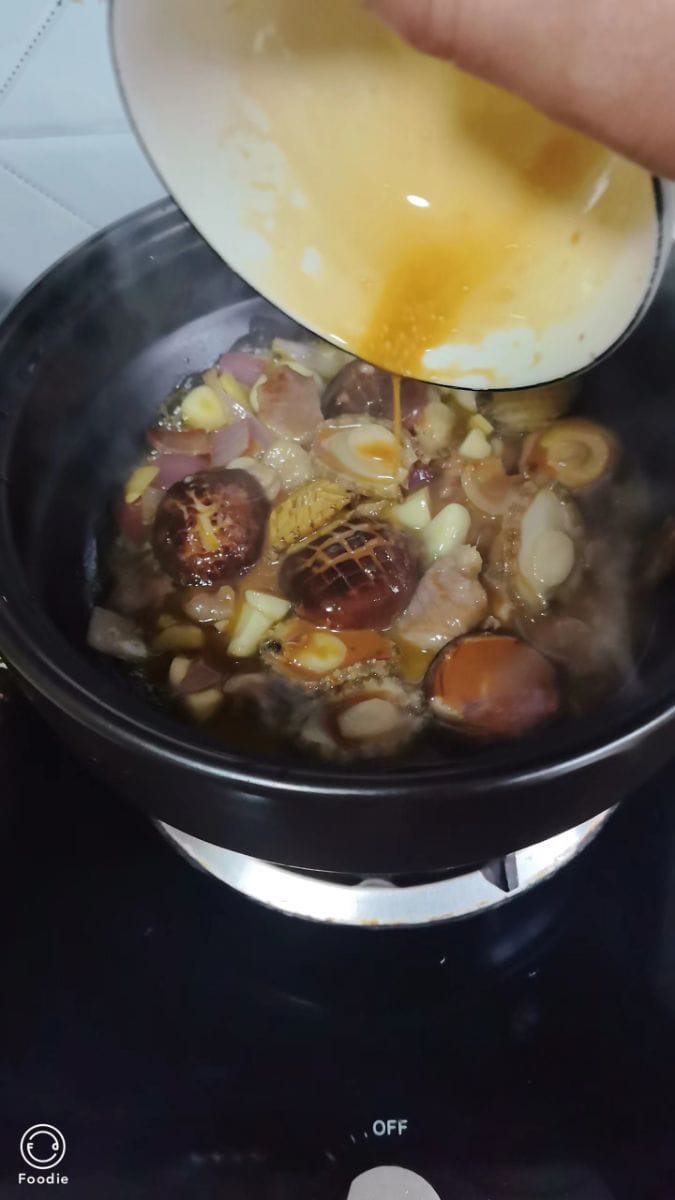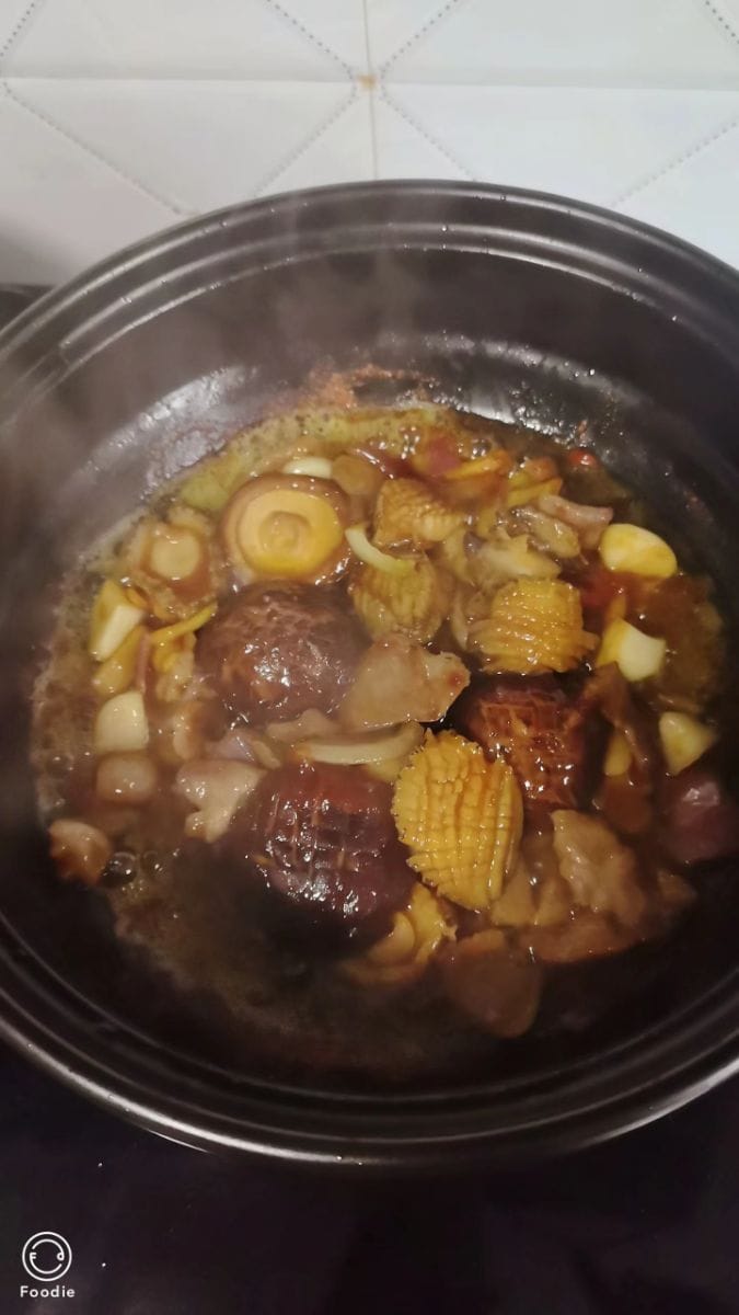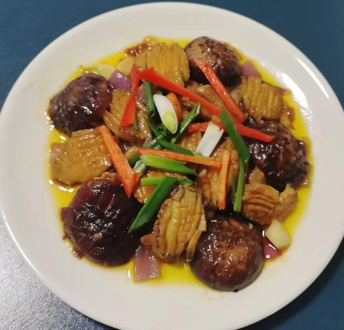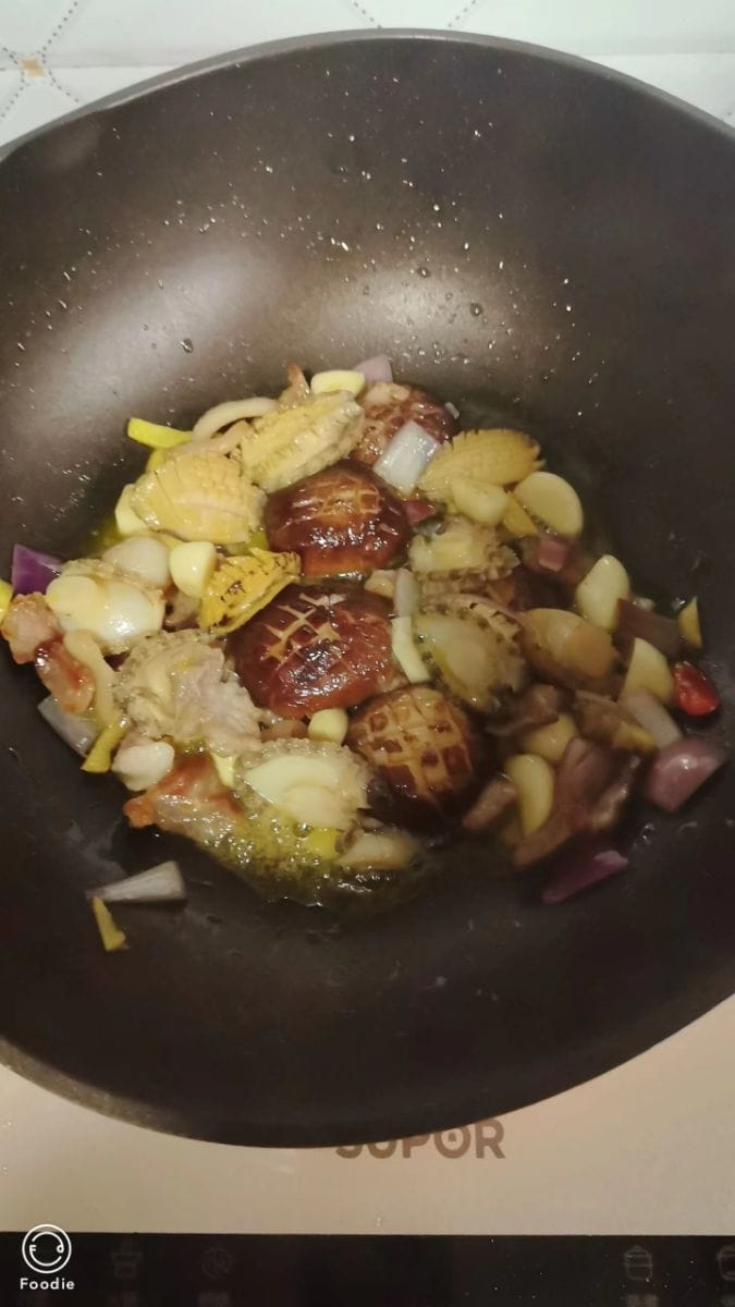 หอยเป๋าฮื้อตุ๋นเห็ด หอยเป๋าฮื้อนุ่มและเด้ง ส่วนเห็ดก็อ่อนนุ่มและชุ่มฉ่ำ ทั้งหมดแช่อยู่ในซอสเข้มข้นรสชาติกลมกล่อม เพียงคำเดียวก็สัมผัสได้ถึงรสชาติของทะเลและกลิ่นหอมของเห็ด เสิร์ฟพร้อมต้นหอมซอยและพริกแดง ทั้งอร่อยและน่ารับประทาน