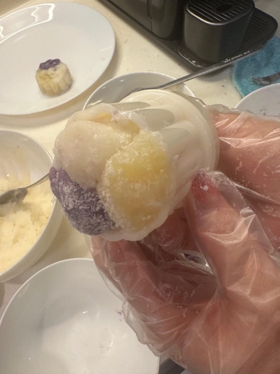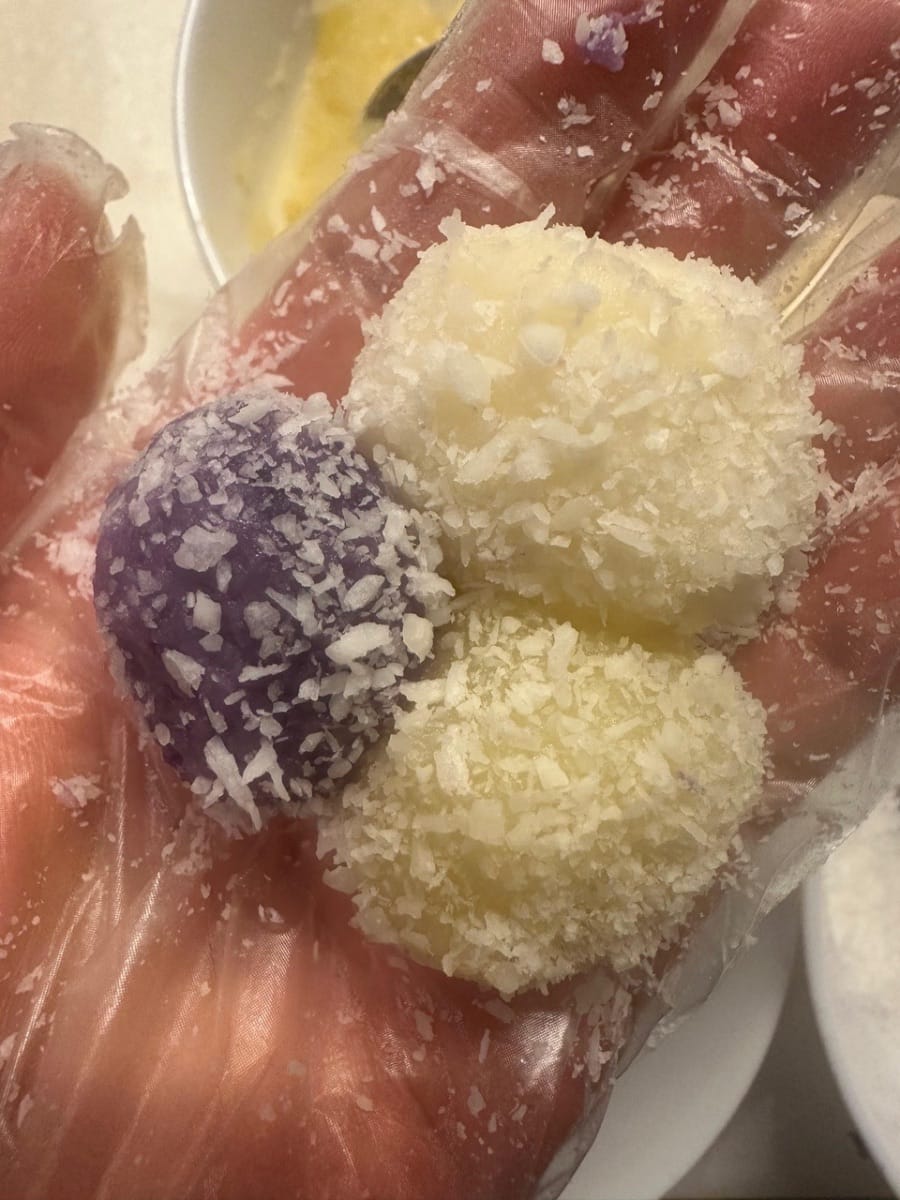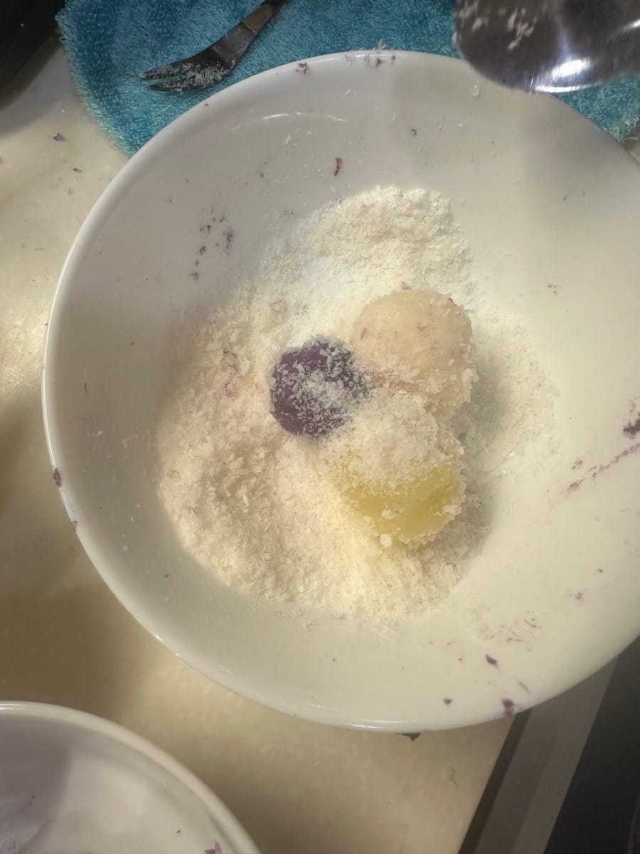 เมื่อทำน้ำซอสข้นเสร็จแล้ว นำแป้งจากแต่ละชามมาปั้นเป็นก้อนเล็กๆ แล้วประกบเข้าด้วยกันดังภาพ