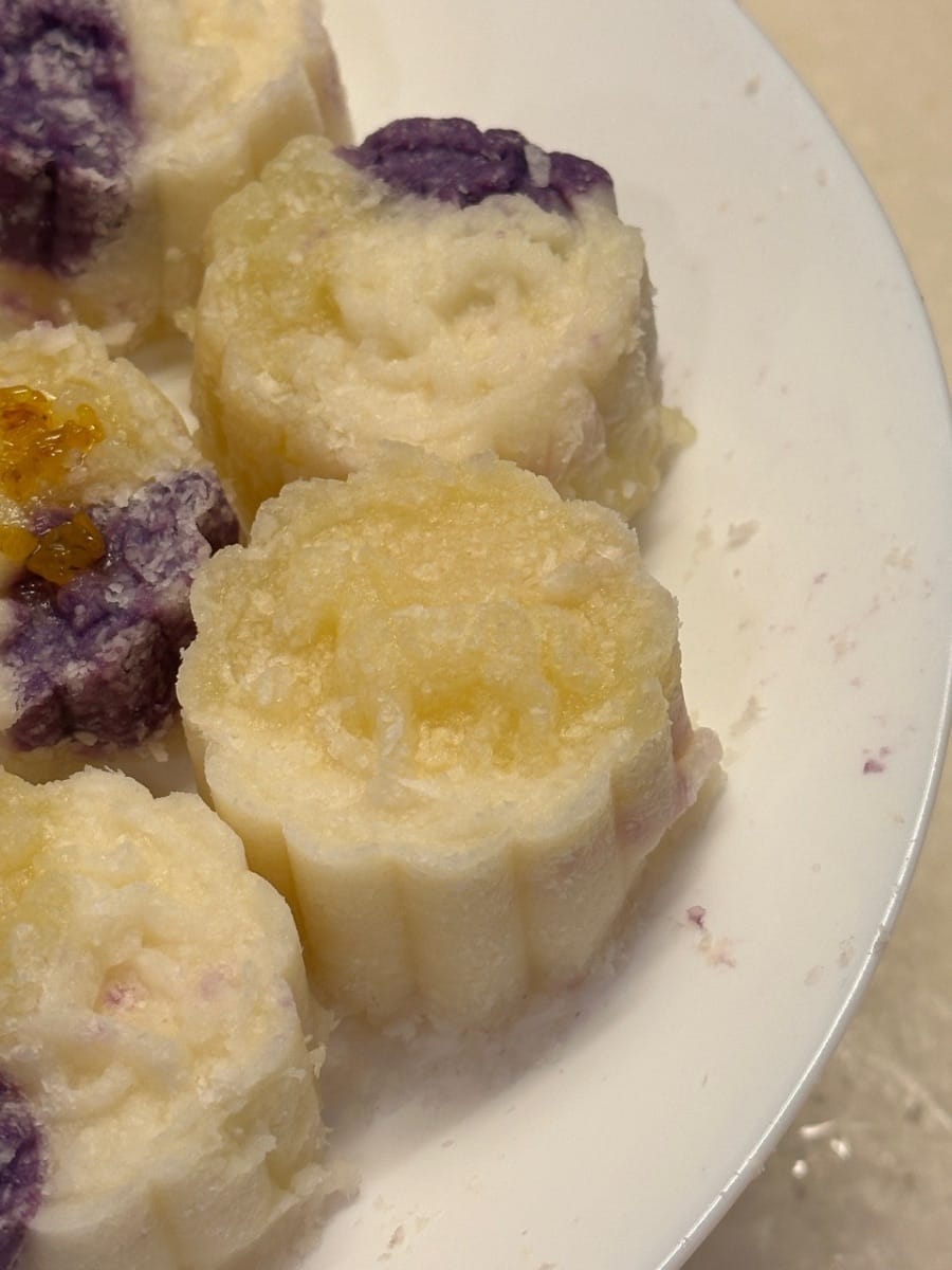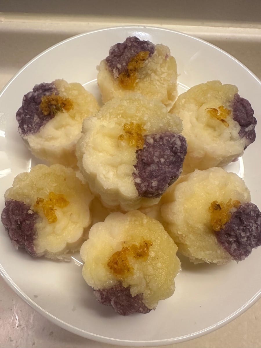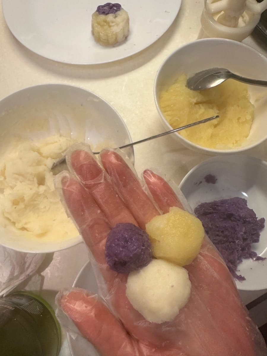 เริ่มต้นด้วยการนึ่งมันม่วง มันเทศ และมันฝรั่ง หลังจากปอกเปลือกแล้ว