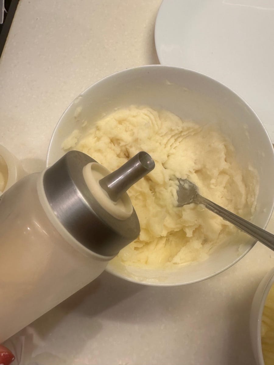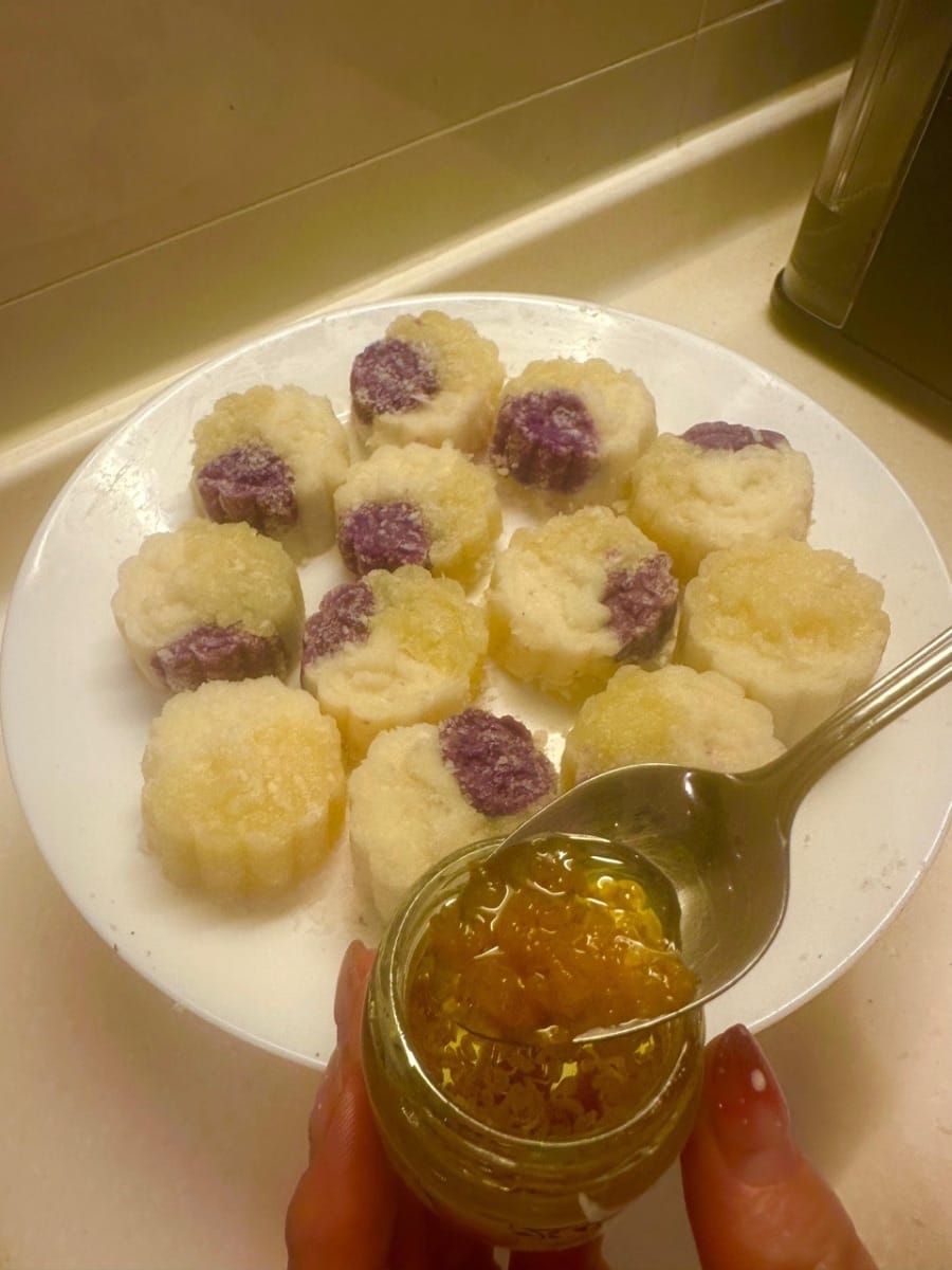 เติมนมข้นหวาน 10 กรัมลงในมันเทศและมันฝรั่งตามลำดับ