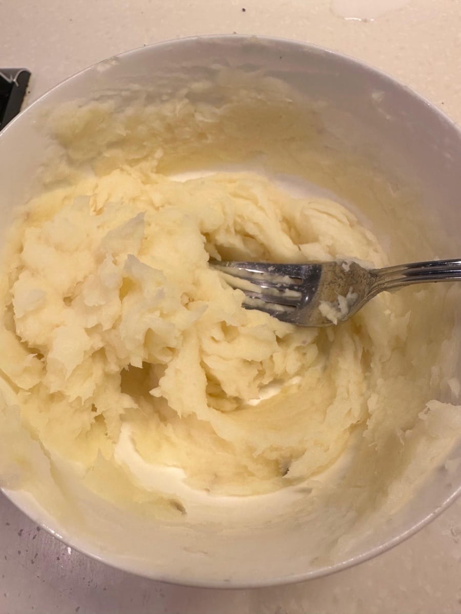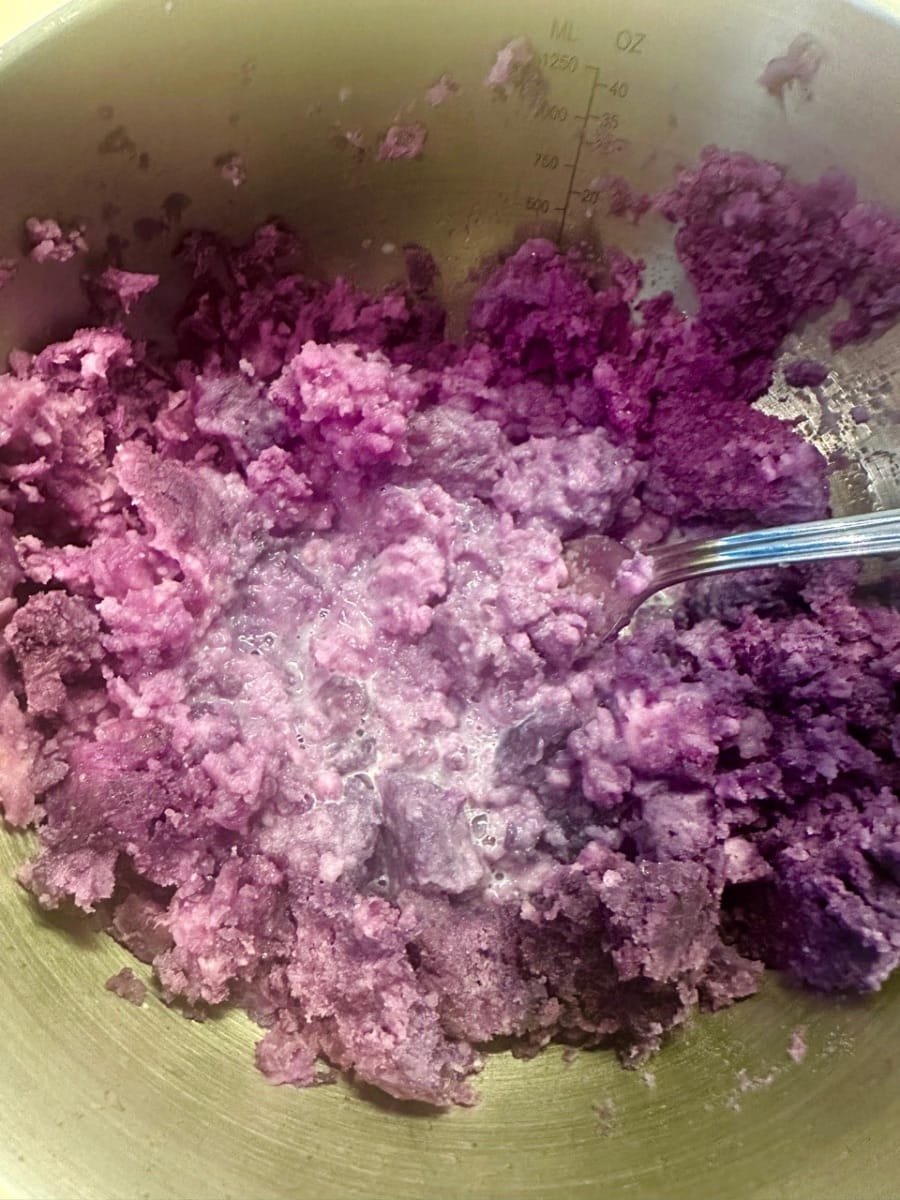 เมื่อนึ่งสุกทั่วแล้ว บดมันม่วงด้วยส้อม แล้วเติมนมลงไปขณะที่ยังร้อนอยู่