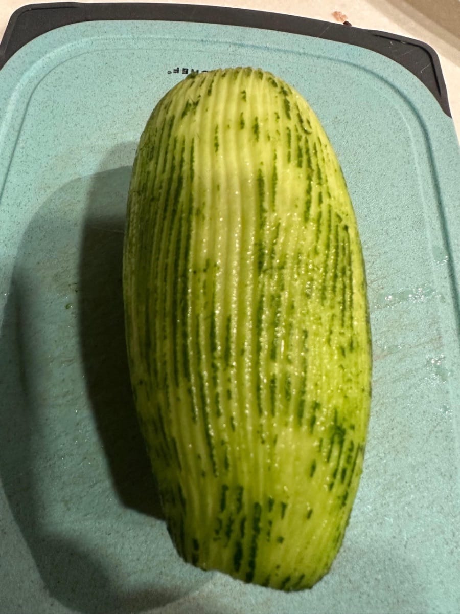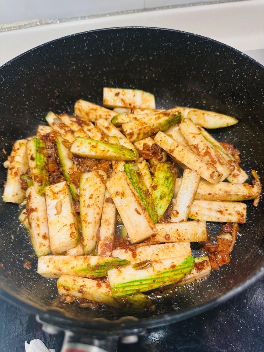 ปอกเปลือกบวบแล้วหั่นเป็นชิ้นยาวๆ