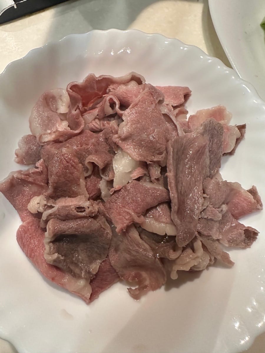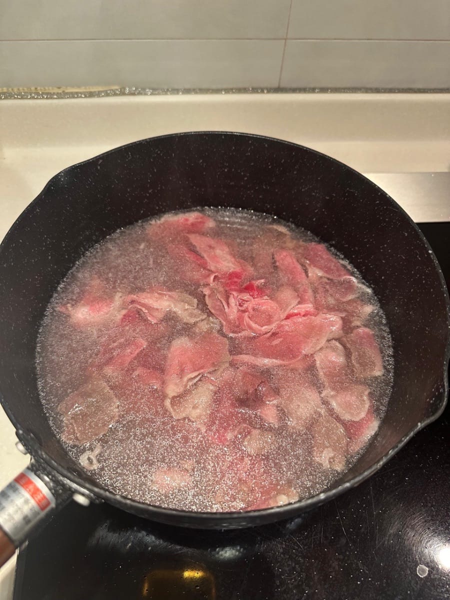 ลวกเนื้อวัวในน้ำเดือดสักครู่จนเปลี่ยนเป็นสีน้ำตาล นำออกจากหม้อเมื่อสุกแล้ว