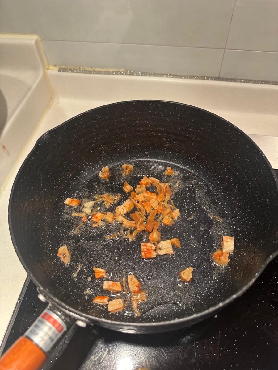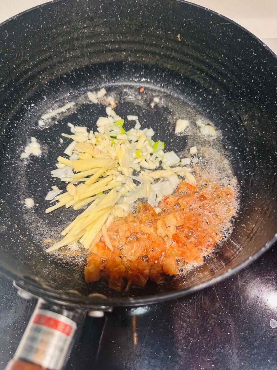 นำกุ้งแห้งและหอยเชลล์ไปผัดในกระทะที่ร้อนใส่น้ำมัน