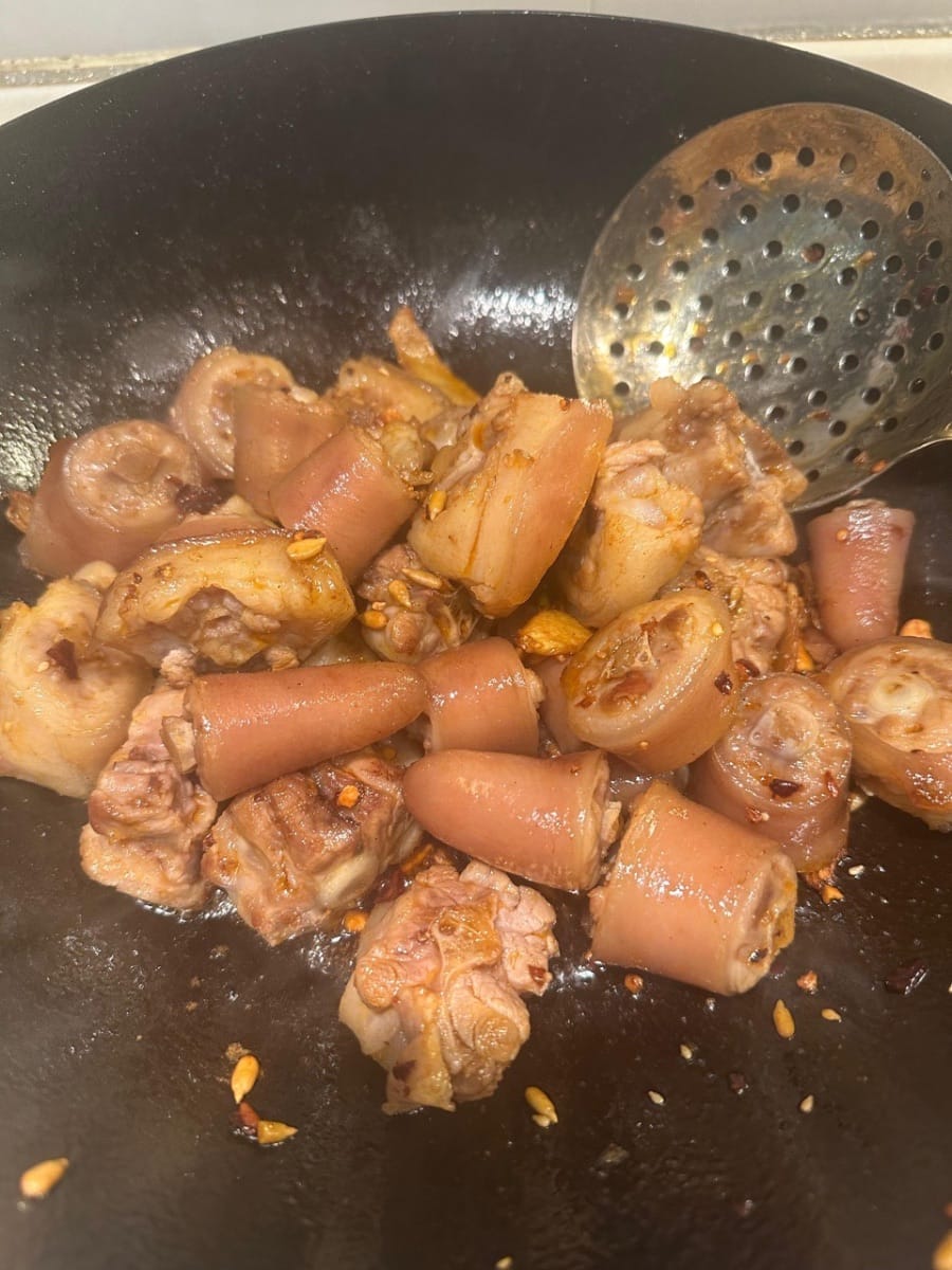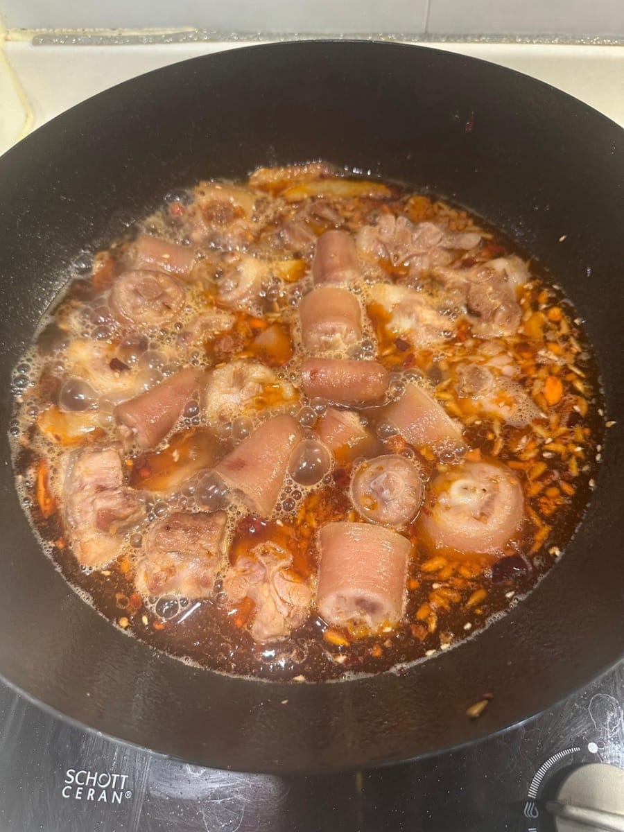 ใส่หางหมูที่สุกแล้วกลับลงไปในกระทะเพื่อปรุงรสและทำให้ซอสข้นขึ้น