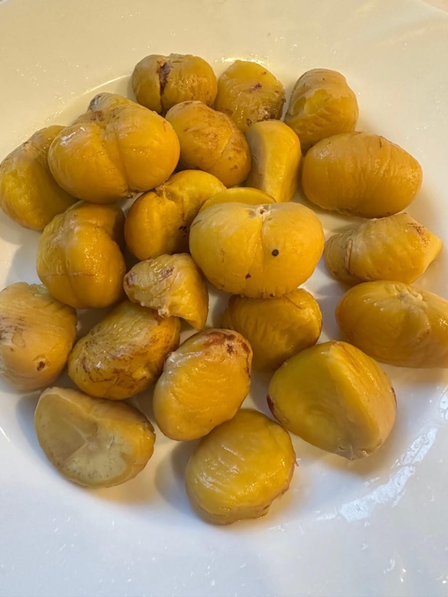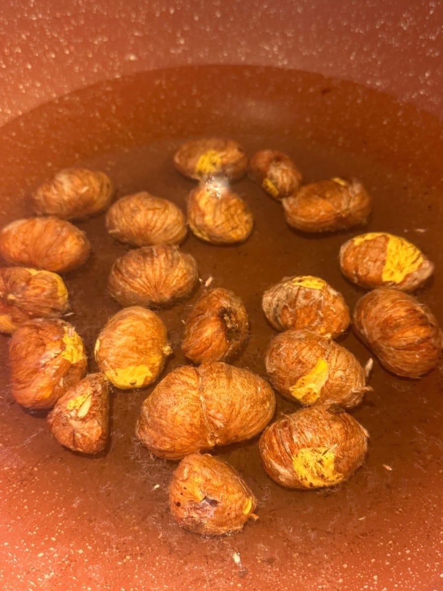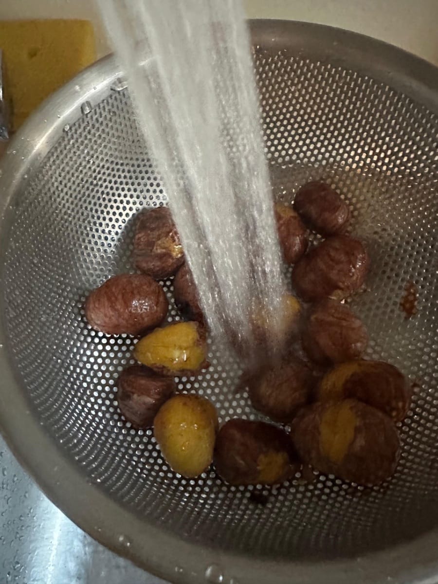 ลวกเกาลัดในน้ำเดือดประมาณ 1 นาที จนกว่าจะสามารถปอกเปลือกได้ จากนั้นล้างด้วยน้ำเย็นจัด