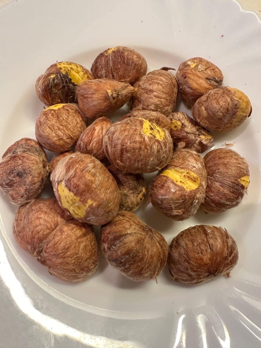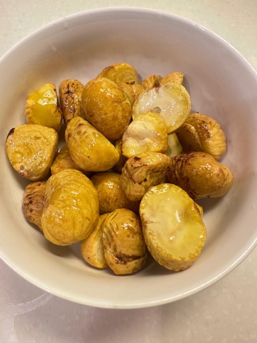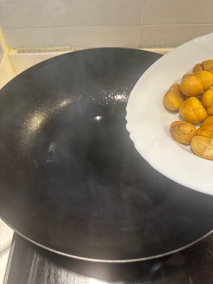 ลวกเกาลัดในน้ำเดือดประมาณ 1 นาที จนกว่าจะสามารถปอกเปลือกได้ จากนั้นล้างด้วยน้ำเย็นจัด