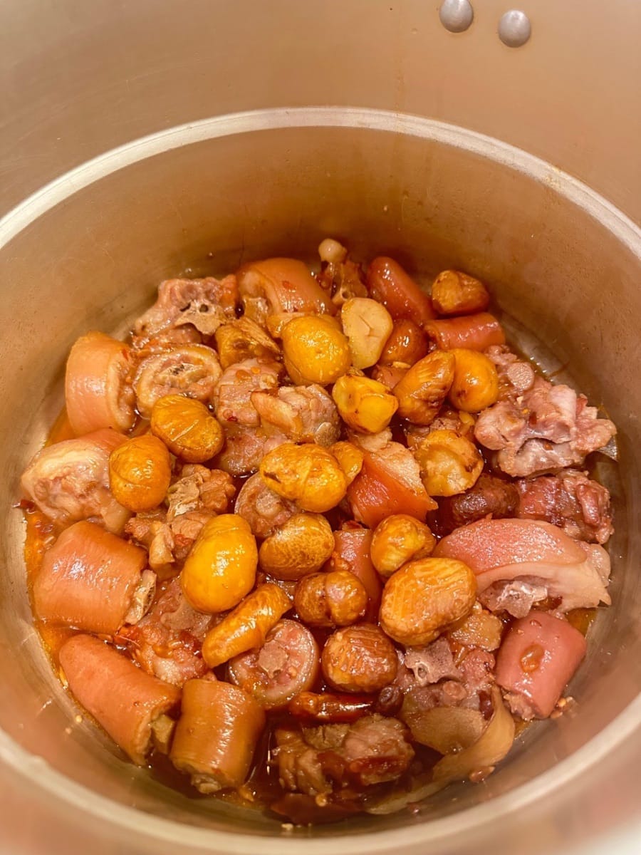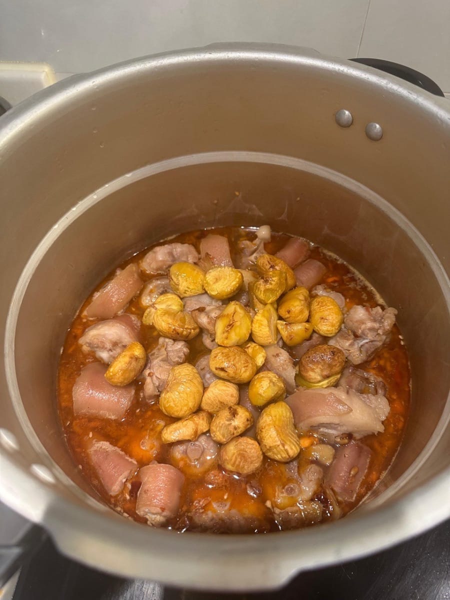 นำไปใส่ในหม้อแรงดันสูงพร้อมกับเกาลัด ปรุงด้วยไฟปานกลางประมาณ 10 นาที