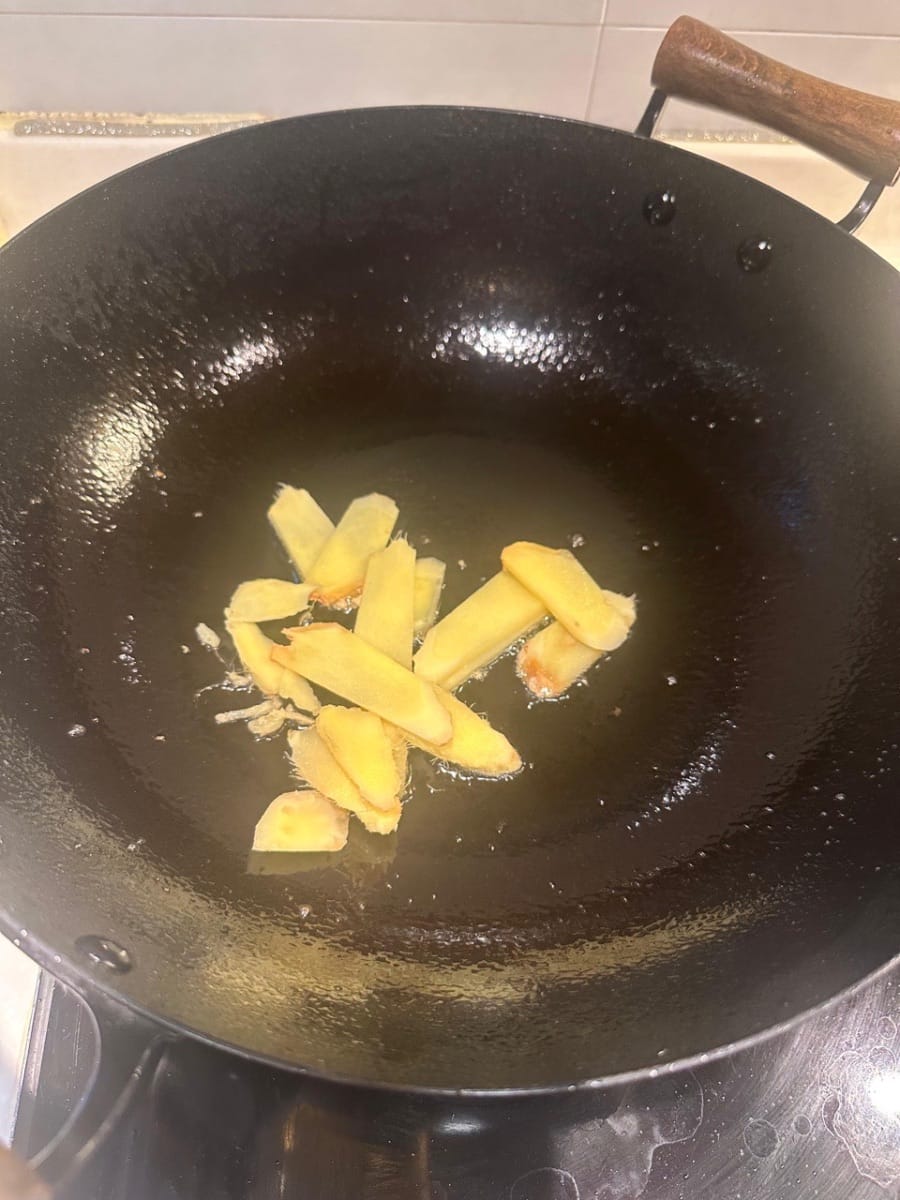 ในกระทะอีกใบ ให้ผัดขิงหั่นบางๆ จนเหลืองเล็กน้อย