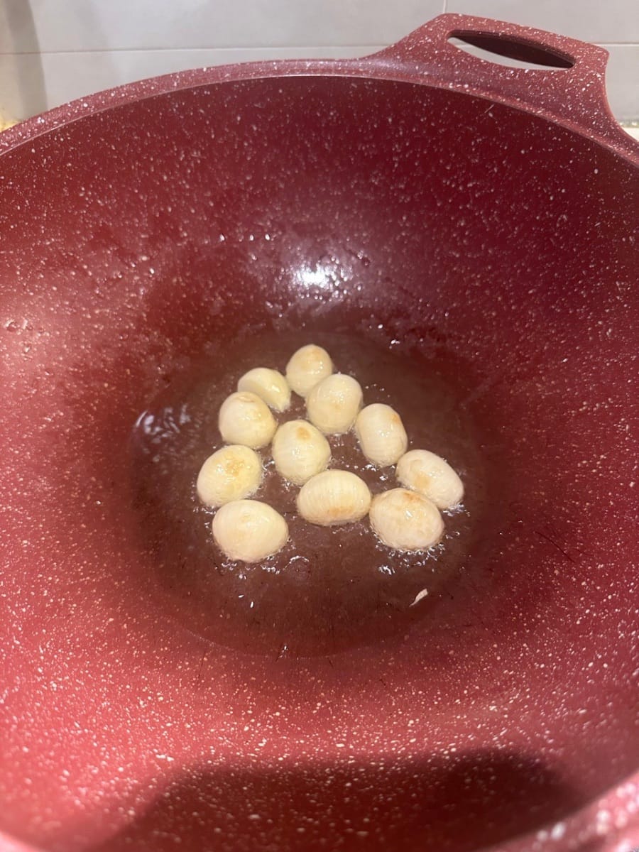 ในกระทะอีกใบ ใส่กระเทียมลงไปผัดจนหอม