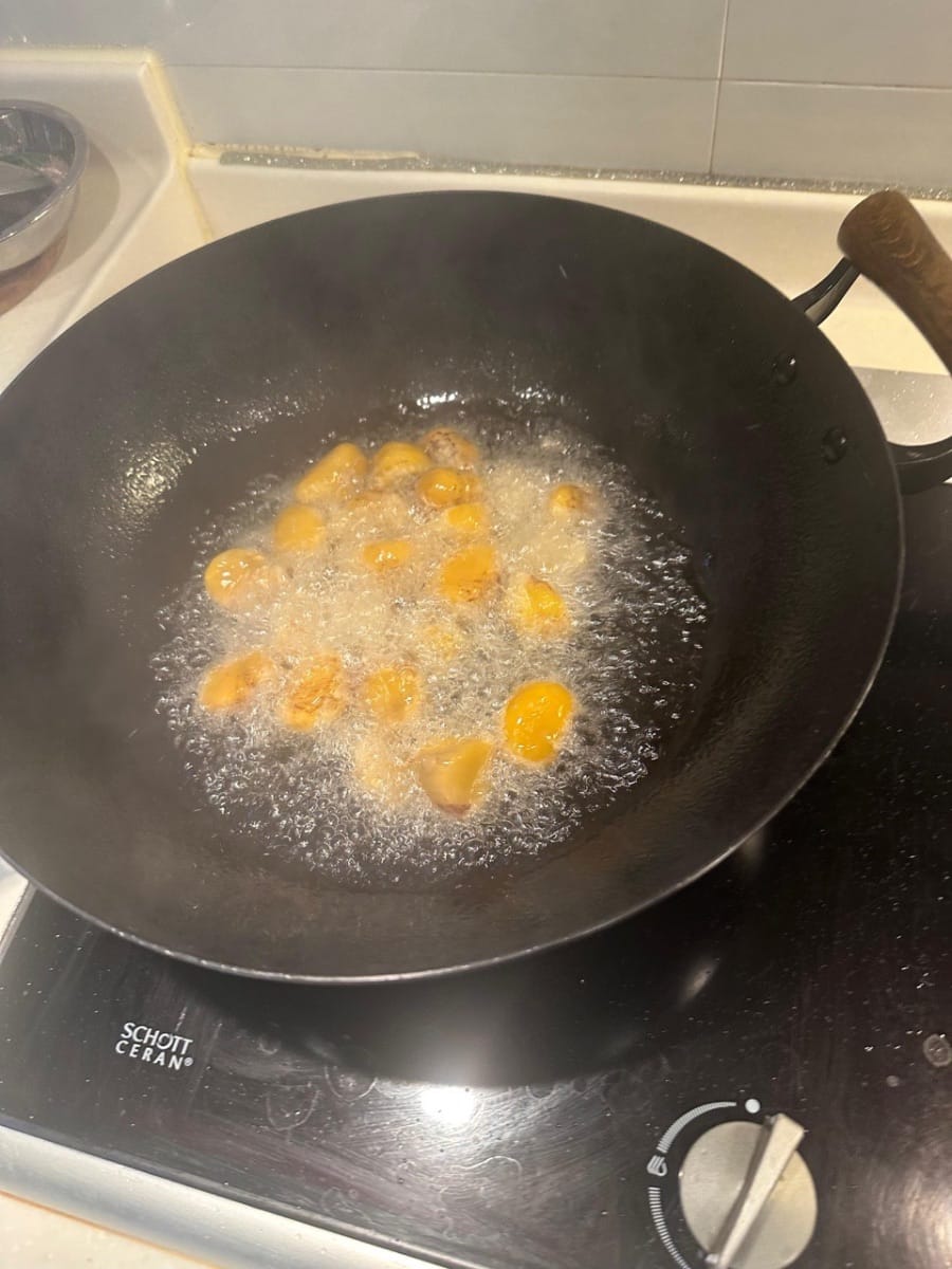 ตั้งกระทะให้ร้อน ใส่น้ำมันข้นสำหรับทอด นำเกาลัดลงไปทอดด้วยไฟปานกลางประมาณ 1 นาที แล้วพักไว้