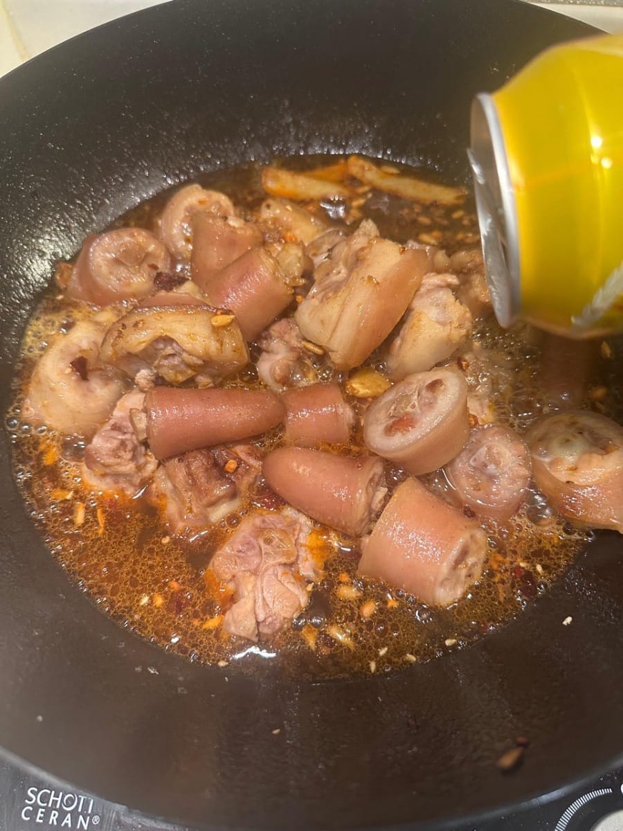 จากนั้นใส่ซีอิ๊วและผงปรุงรสลงไปผัด หลังจากนั้นเทเบียร์ลงไปหนึ่งกระป๋อง แล้วเติมน้ำเดือดลงไปผัดให้ส่วนผสมทั้งหมดสุก