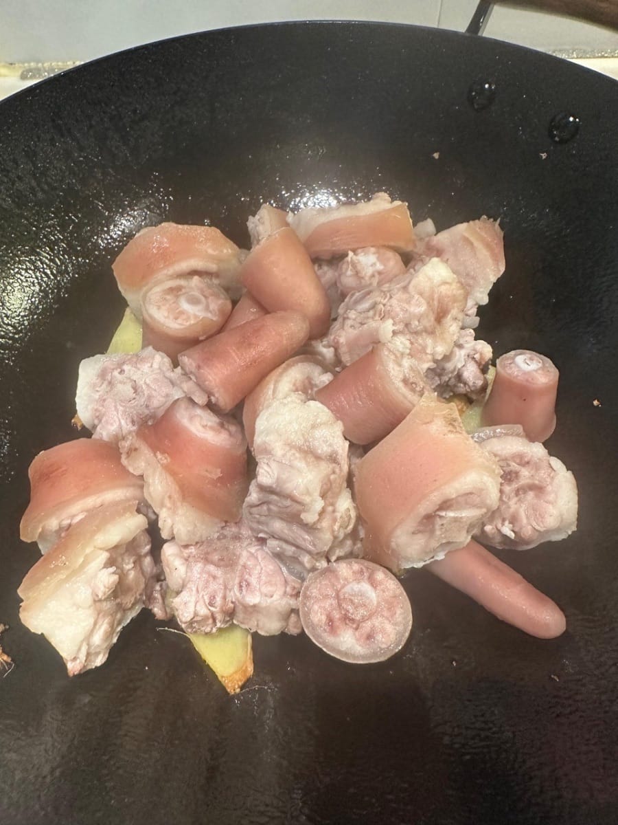 จากนั้นลวกหางหมูในน้ำเดือดประมาณ 3 นาที เมื่อสุกแล้วให้ล้างด้วยน้ำเย็นอีกครั้ง