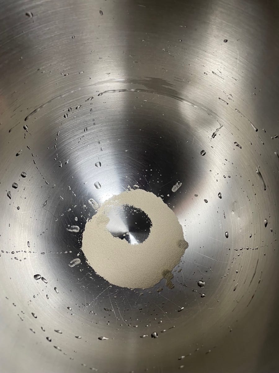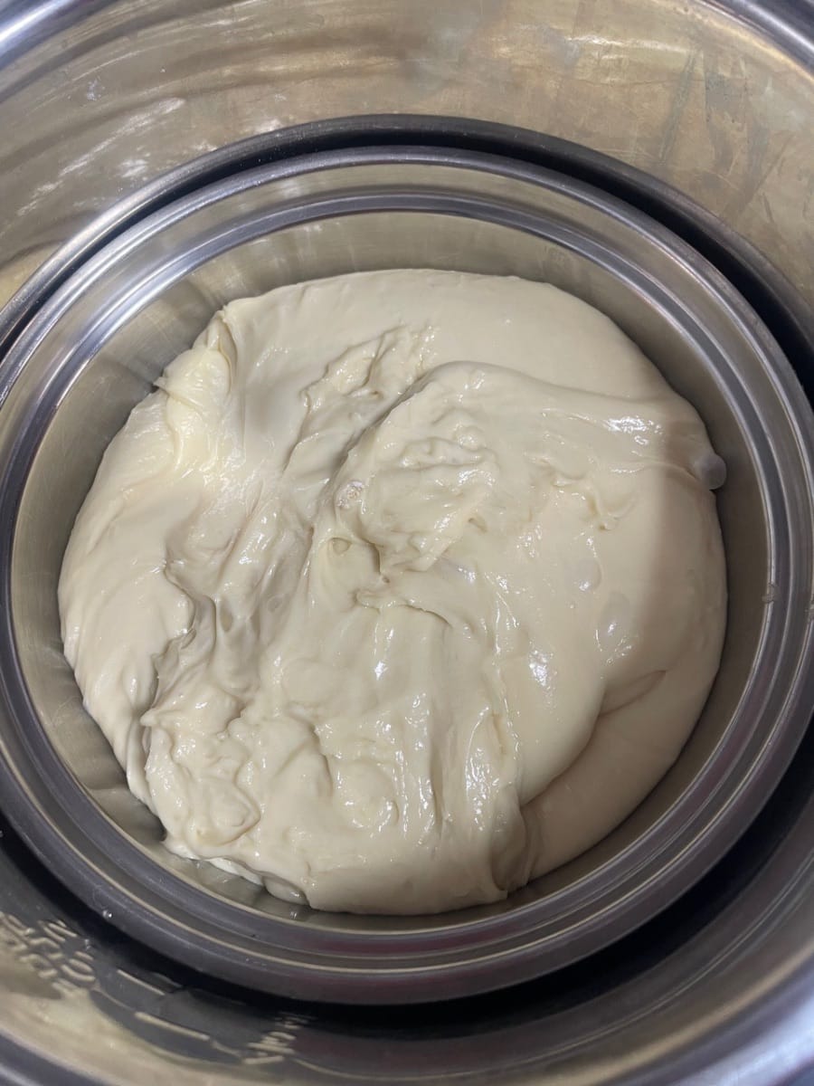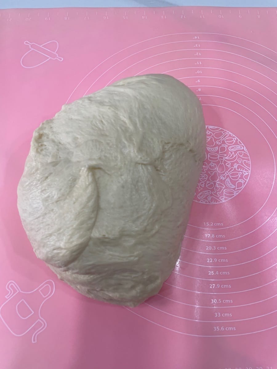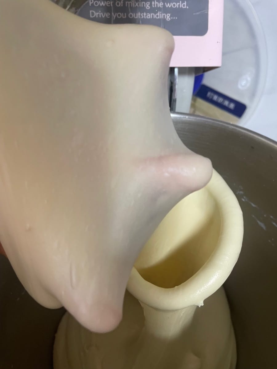 - 开低速和面,先把粉类搅到没有颗粒,再转高速揉到能拉出锯齿状的膜(这是扩展阶段)。