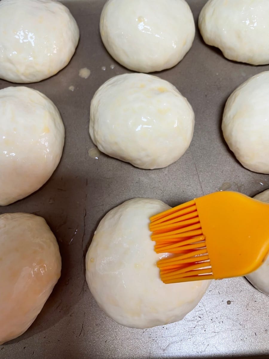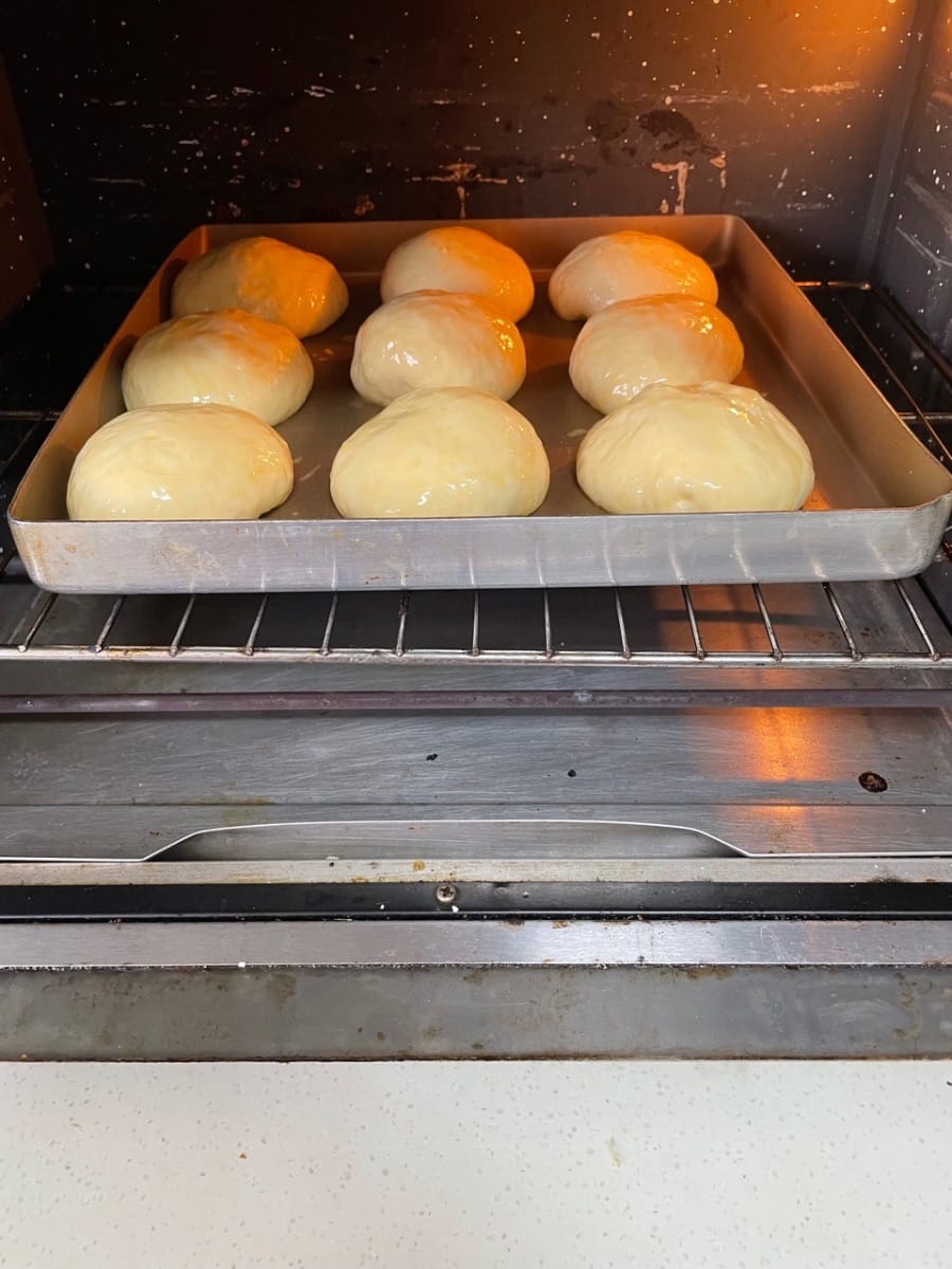- 把整形好的面包生胚放进烤箱,旁边放一碗热水,35°C左右发酵到1.5倍大(9分满模)。拿出来刷一层全蛋液。