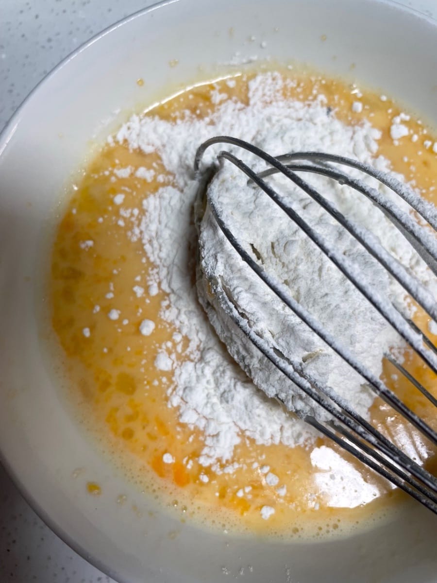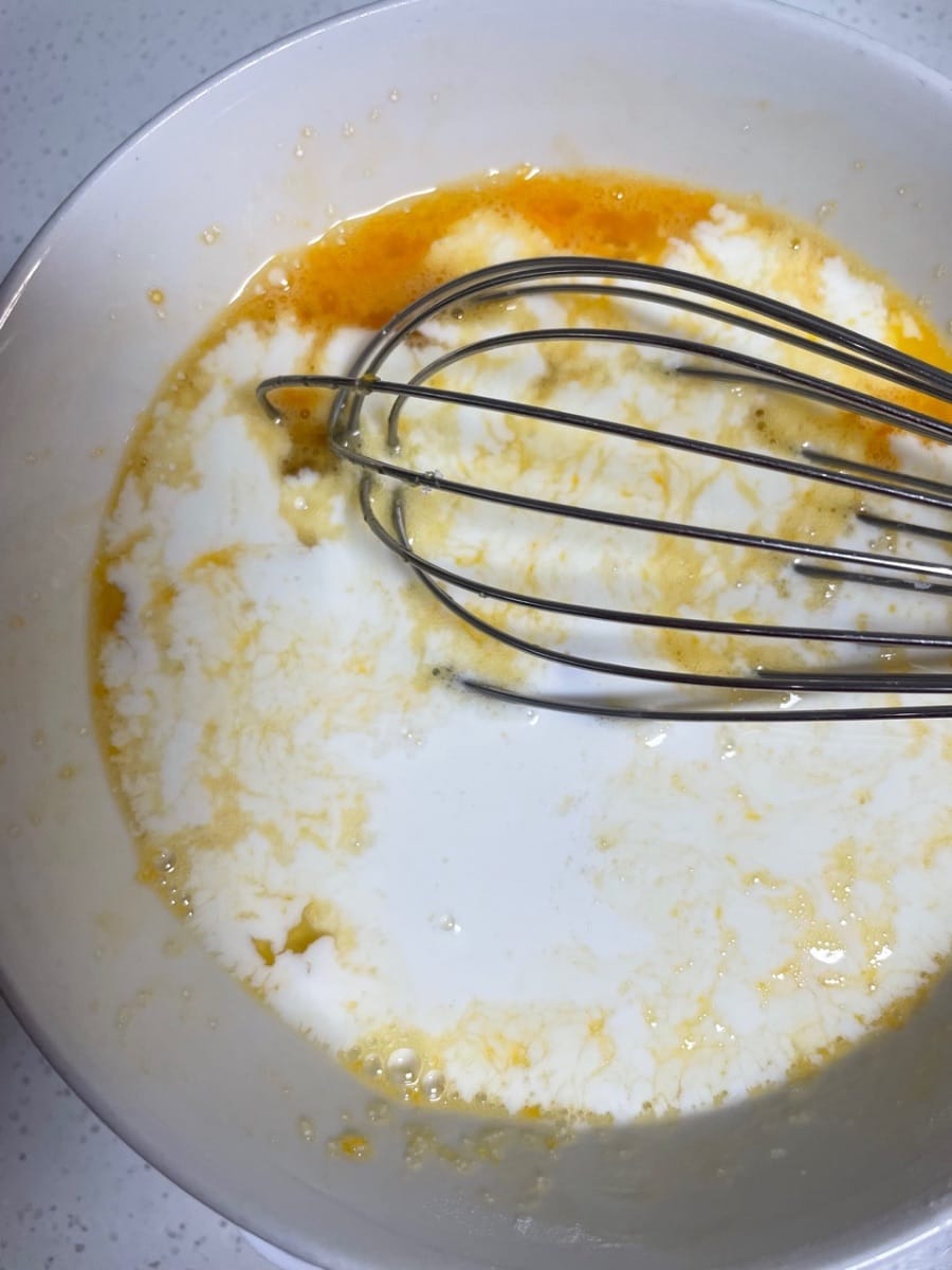 鸡蛋、牛奶、白糖倒一起搅打均匀,再加入低筋面粉翻拌到没有干粉,有点小面疙瘩也不怕,等下炒的时候会压碎。