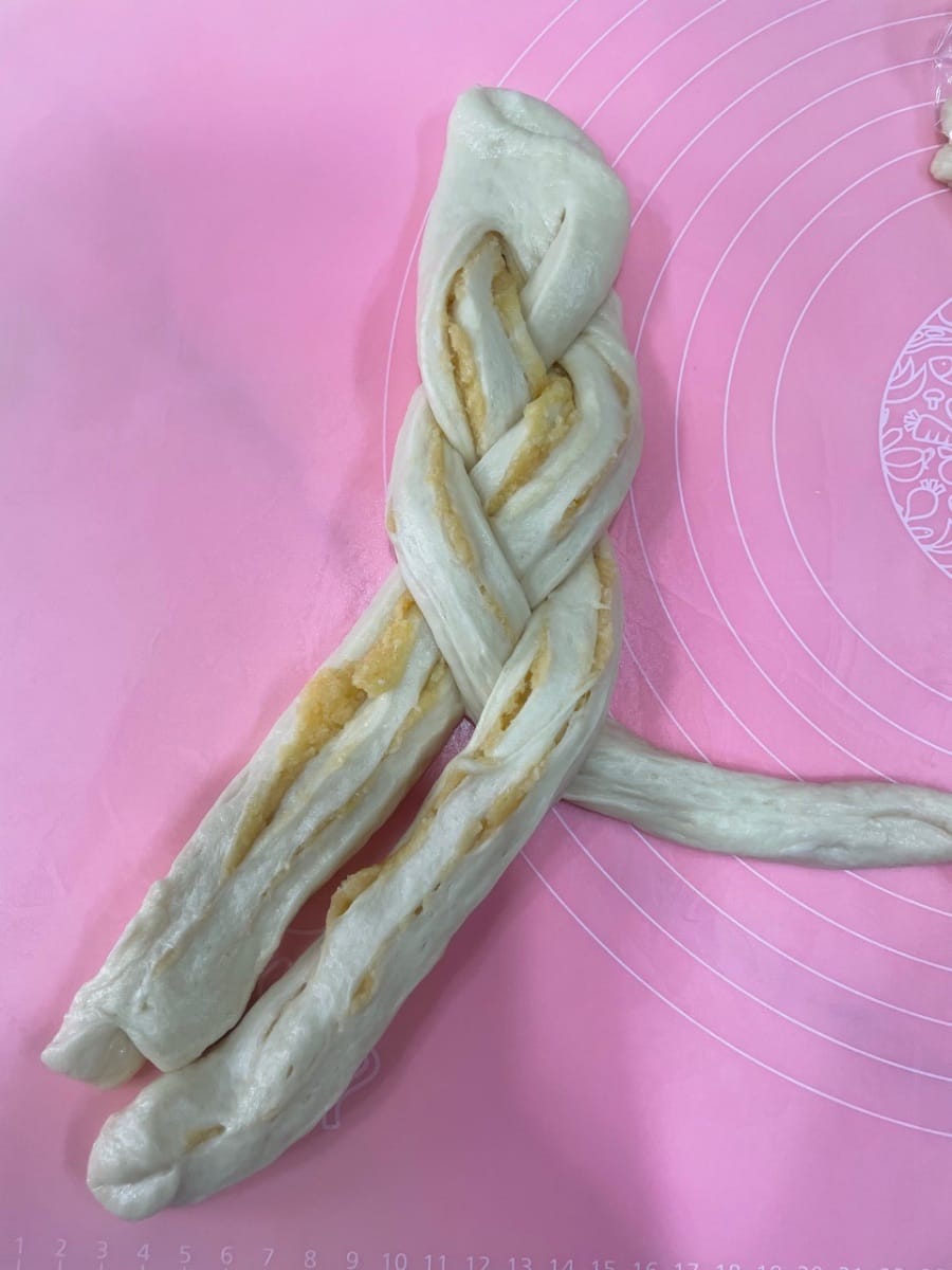用刀切成三条(顶端别切断),有椰蓉的一面朝上,像编辫子一样编起来,收口捏紧。