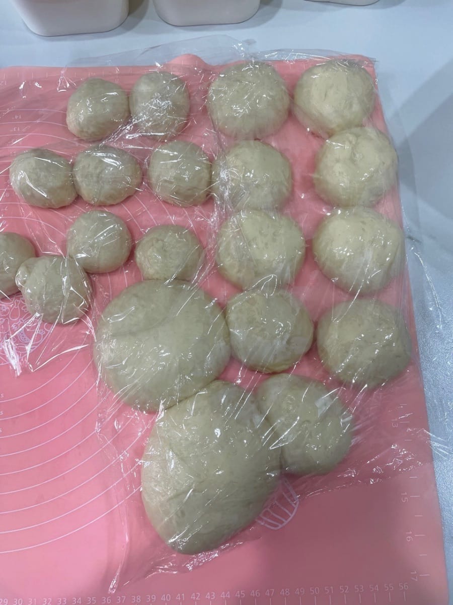 分好的面团揉圆,盖保鲜膜松弛15分钟。