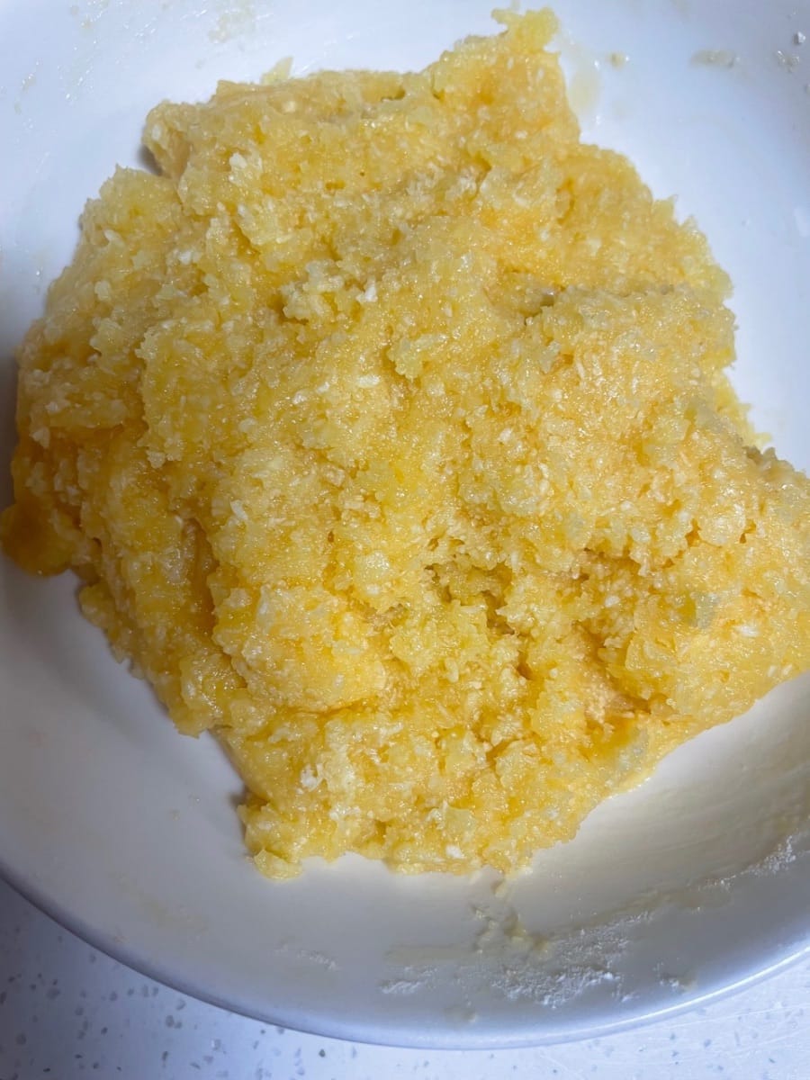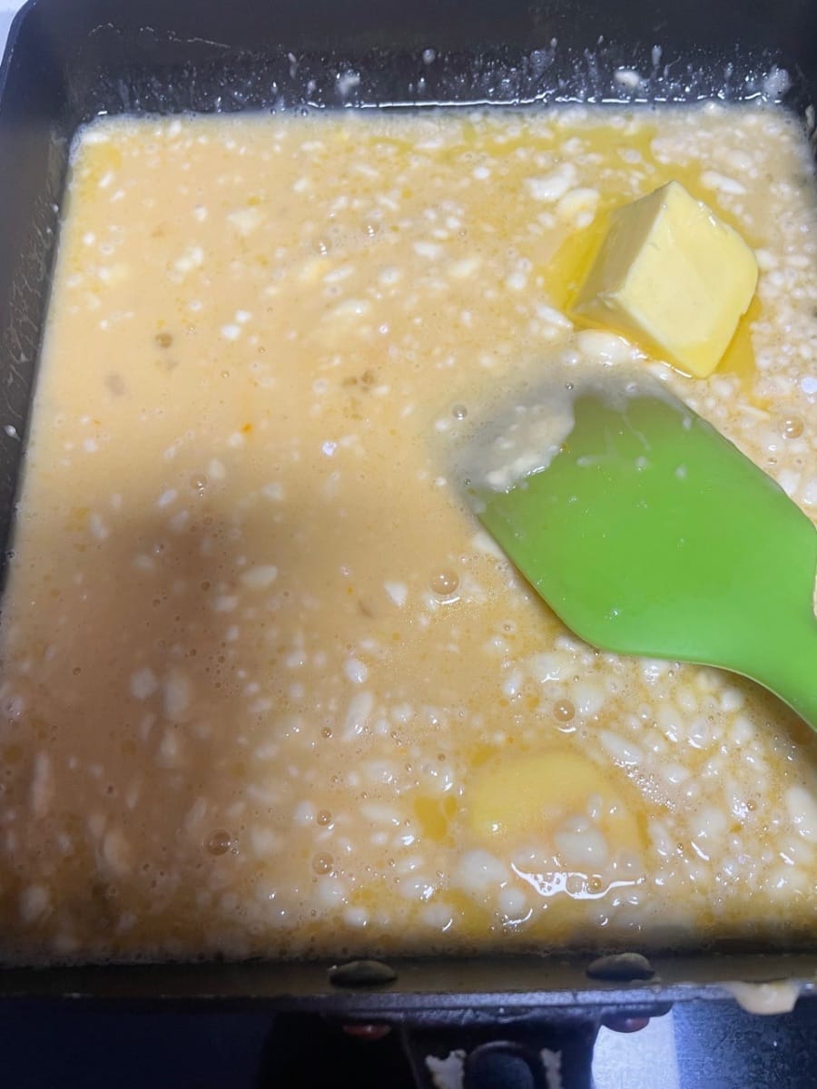 - 黄油放进不粘锅融化,把刚才的面糊倒进去,开小火慢慢炒,用硅胶铲边炒边压碎面疙瘩。