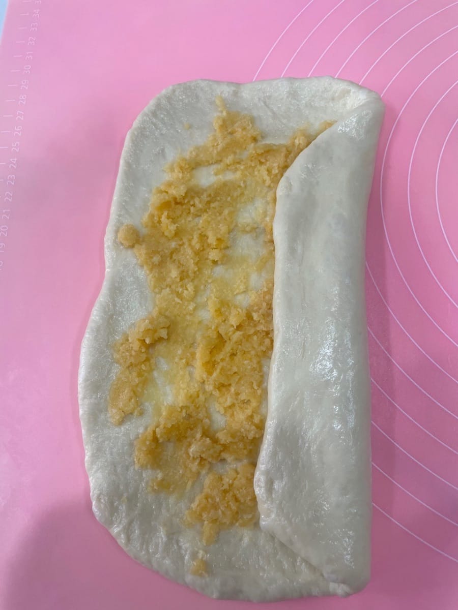 把面团擀平,铺上椰蓉酱,折好再轻轻压扁。