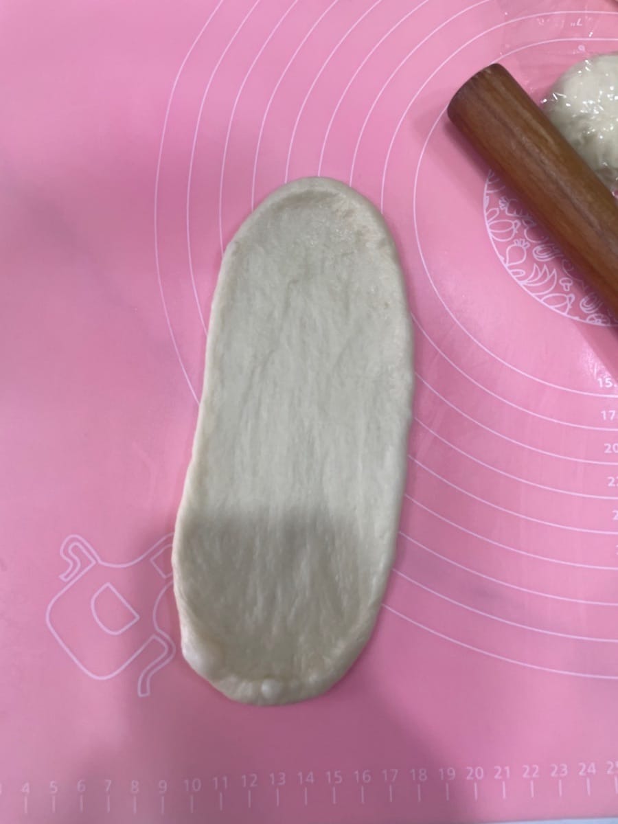 把面团擀成长条,均匀抹上一层椰蓉馅,卷起来。