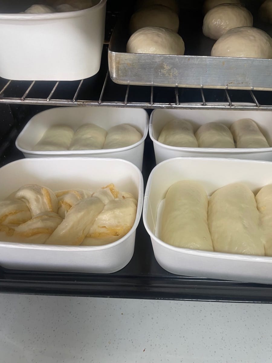 把两端向里卷成一个圆,放进240g的一次性面包盒里发酵。