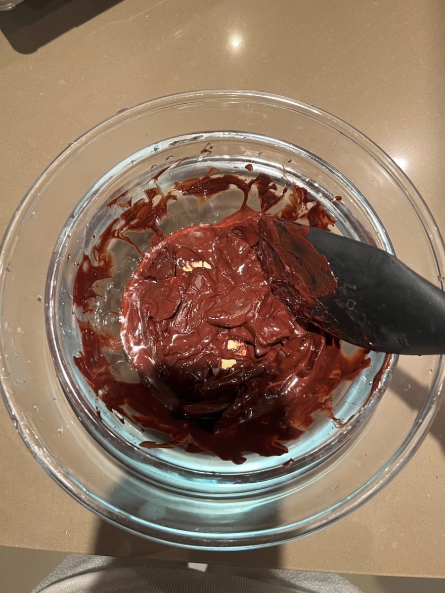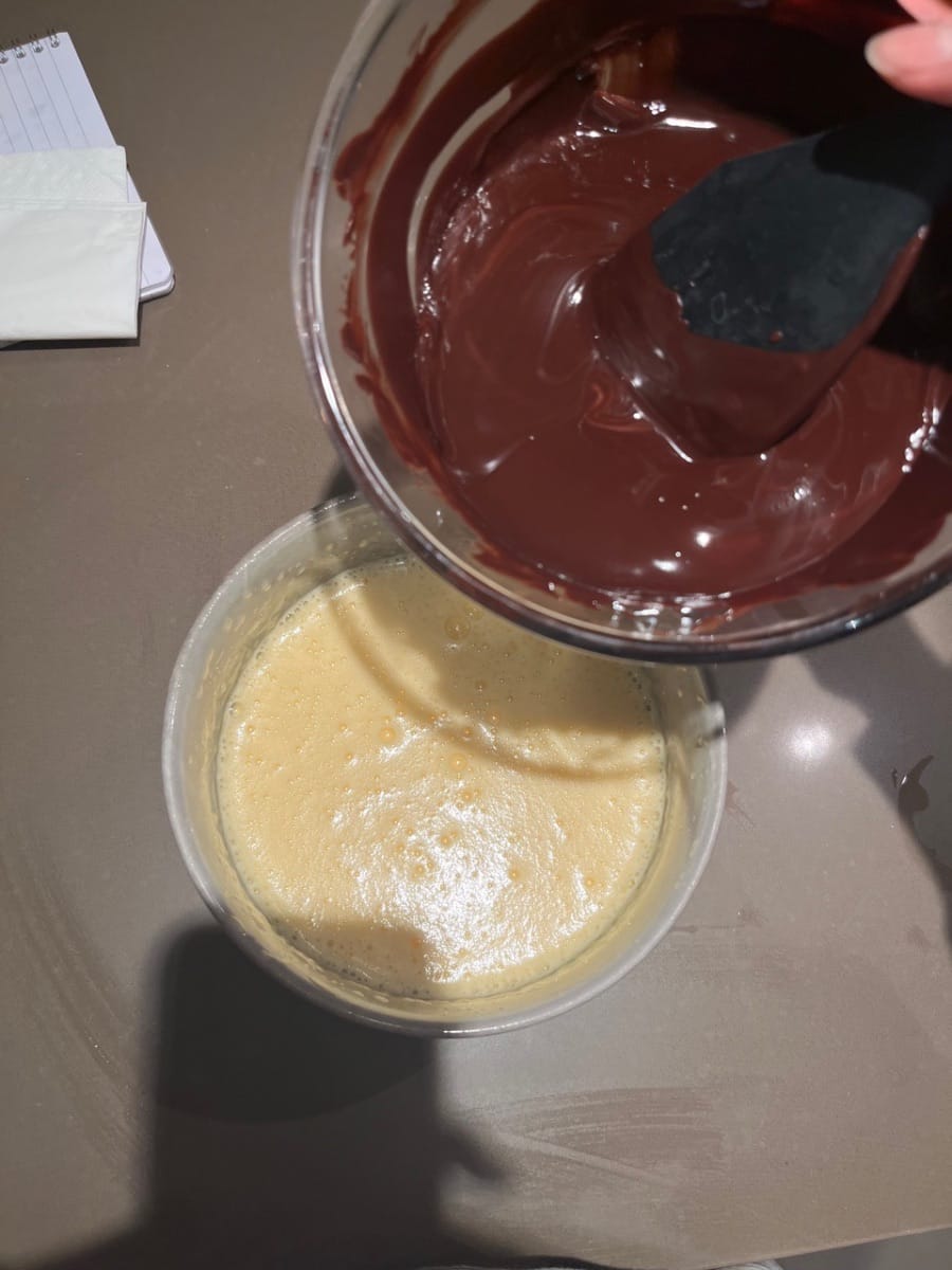 将朱古力混合物同蛋混合一齐