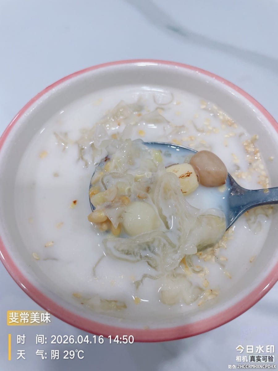 这碗羹堪称天然的轻食滋养宝藏,银耳炖煮出满满植物胶质,搭配藜麦、燕麦的优质蛋白与膳食纤维,莲子、绿豆则平衡口感与营养,再以椰浆、牛奶赋予温润奶香。入口是银耳糯叽叽的胶感,混着谷物绵密的颗粒感,椰香奶香在舌尖化开,口感层次丰富又顺滑。低负担、高营养,一碗下肚,饱腹又润燥,是当下超火的治愈系健康食品。