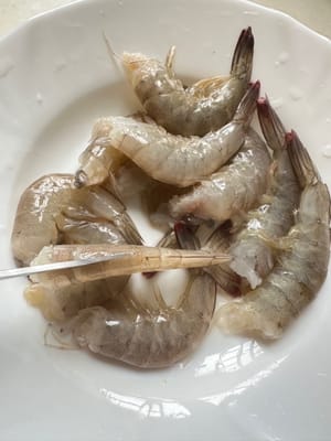 虾洗净去头。用剪刀开背。剥皮