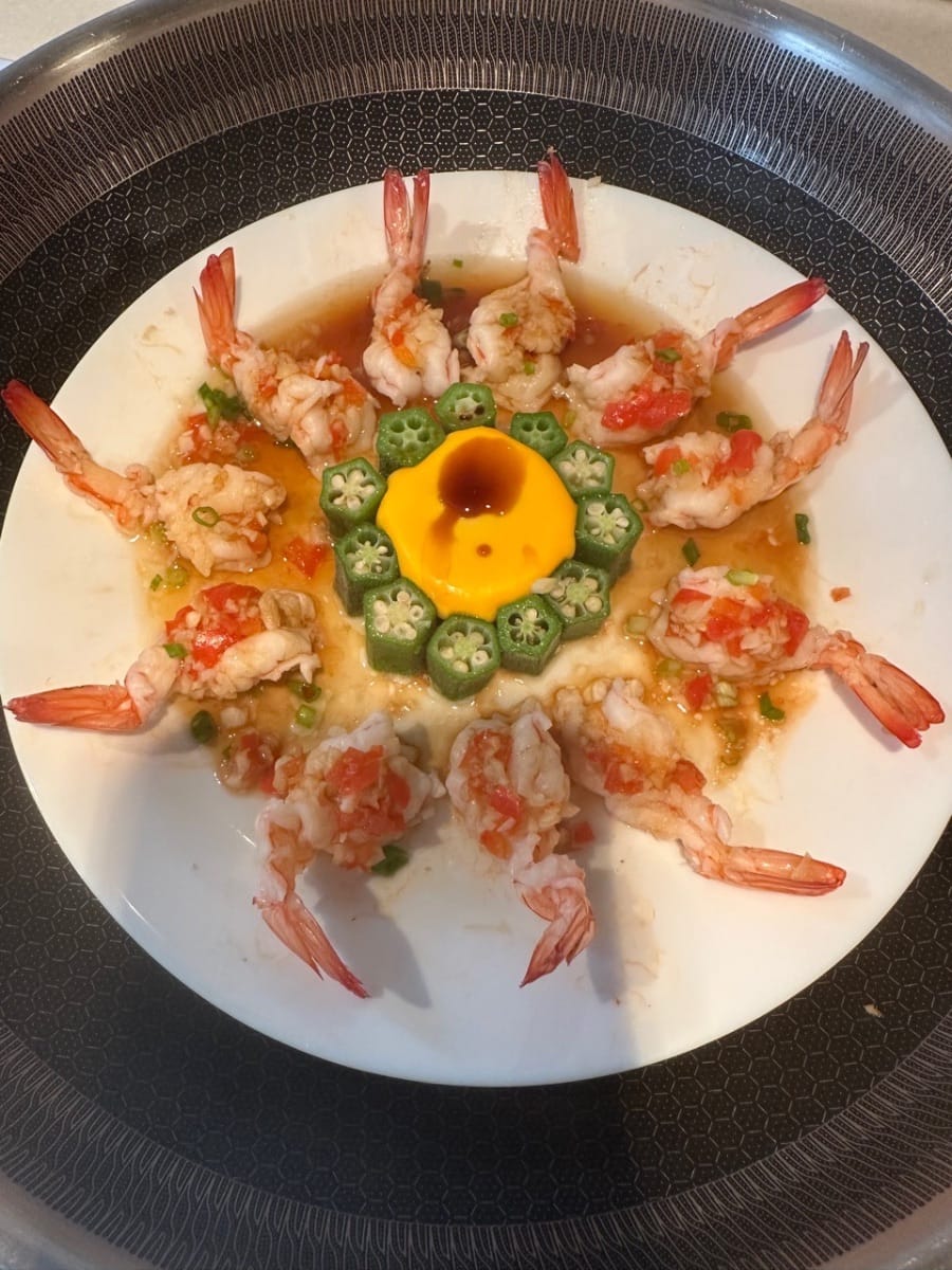 整理好的虾,铺在盘中。将秋葵切成半寸长摆在虾的中央。外框的秋葵比内框的长一点点。