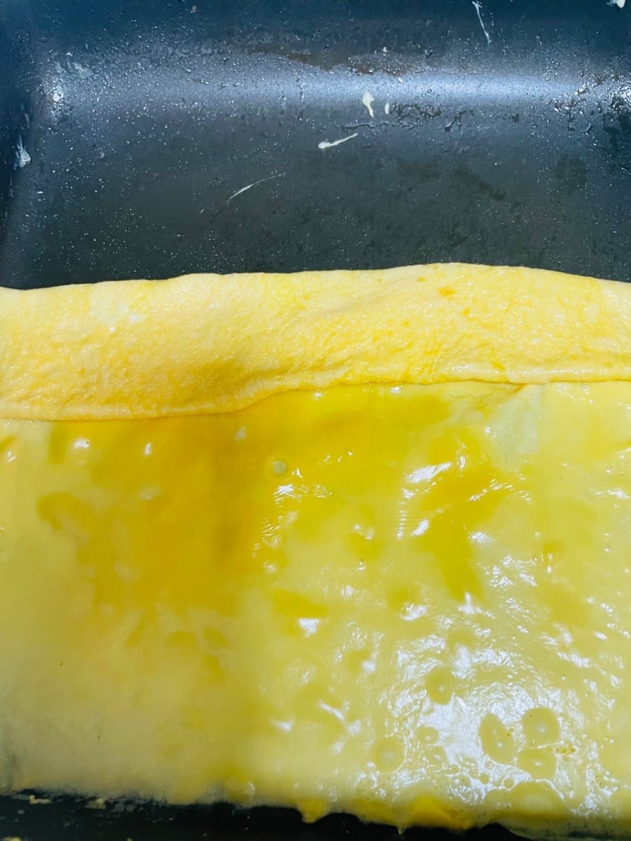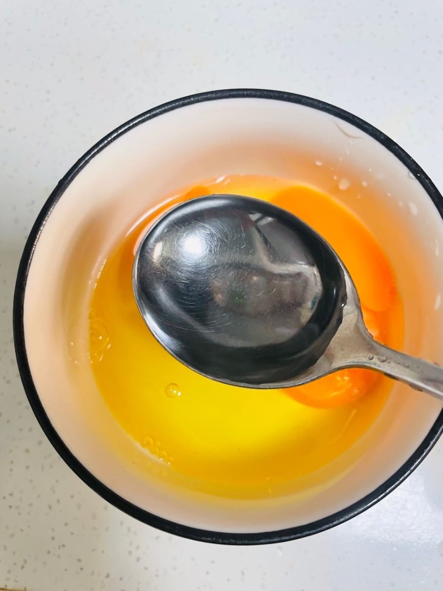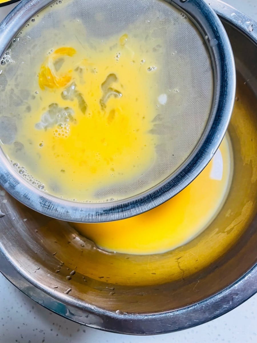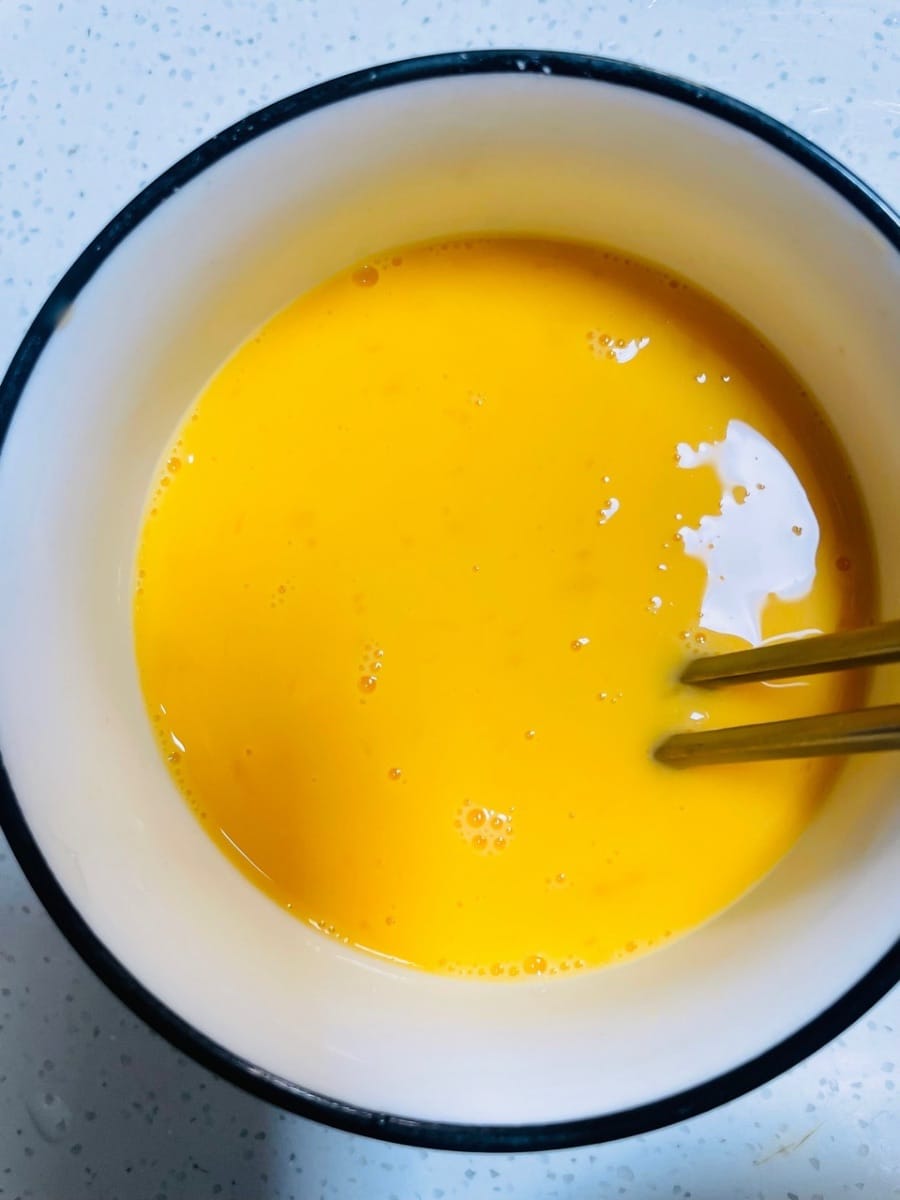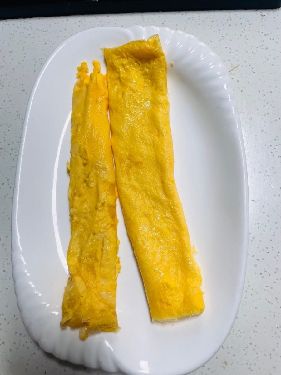 将3只鸡蛋打散,加入5克玉米淀粉、3汤匙水,搅拌均匀。若想蛋皮更细腻,可过筛。随后将蛋液倒入平底锅,小火煎成蛋皮,可整张裹入寿司,也可切成丝备用。