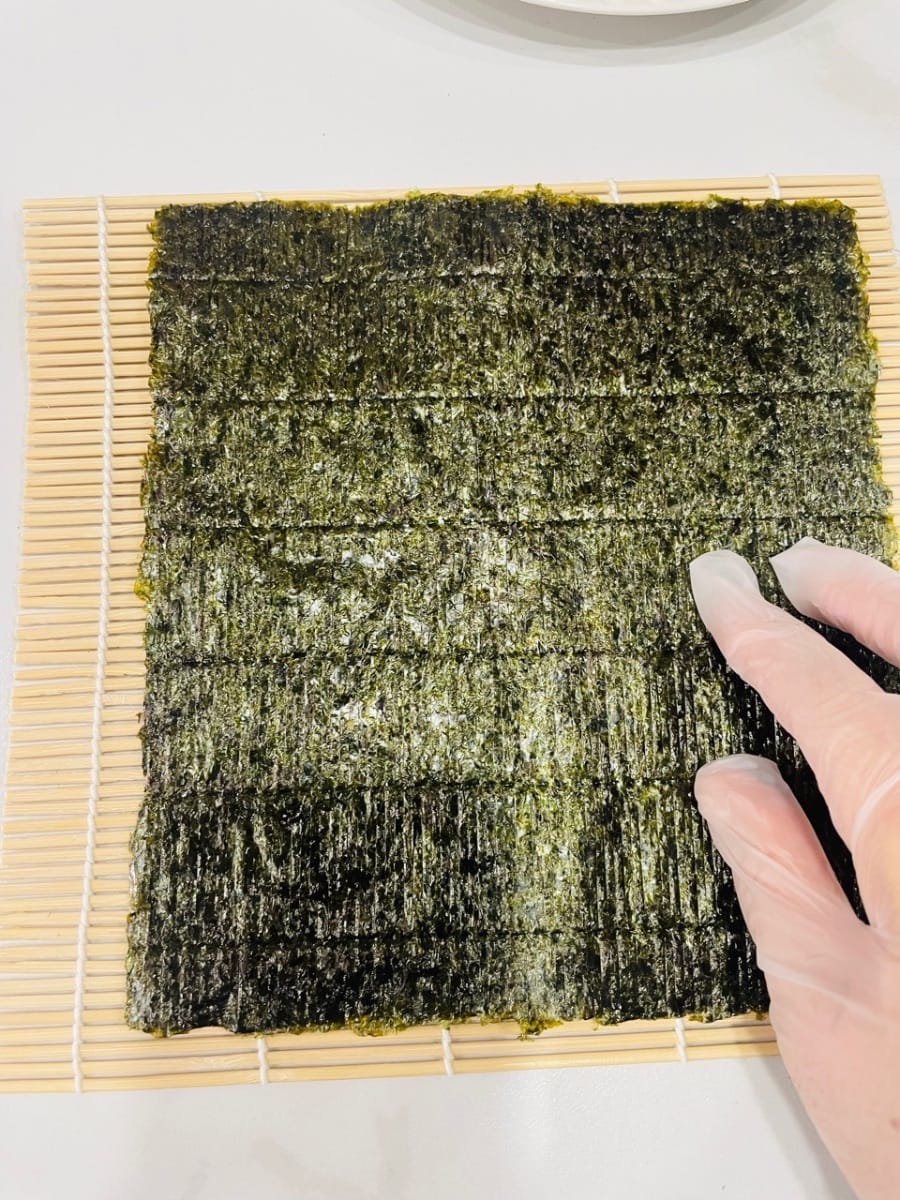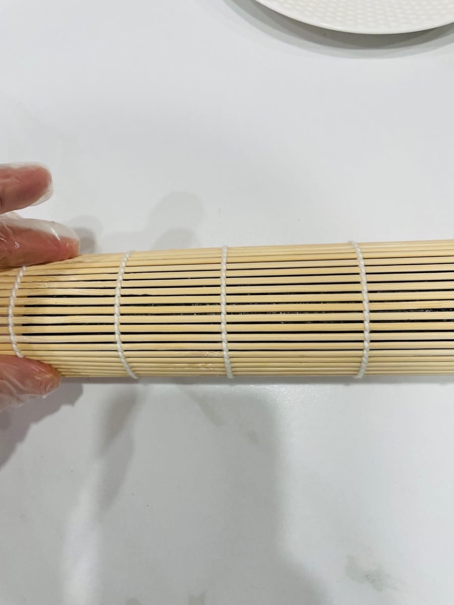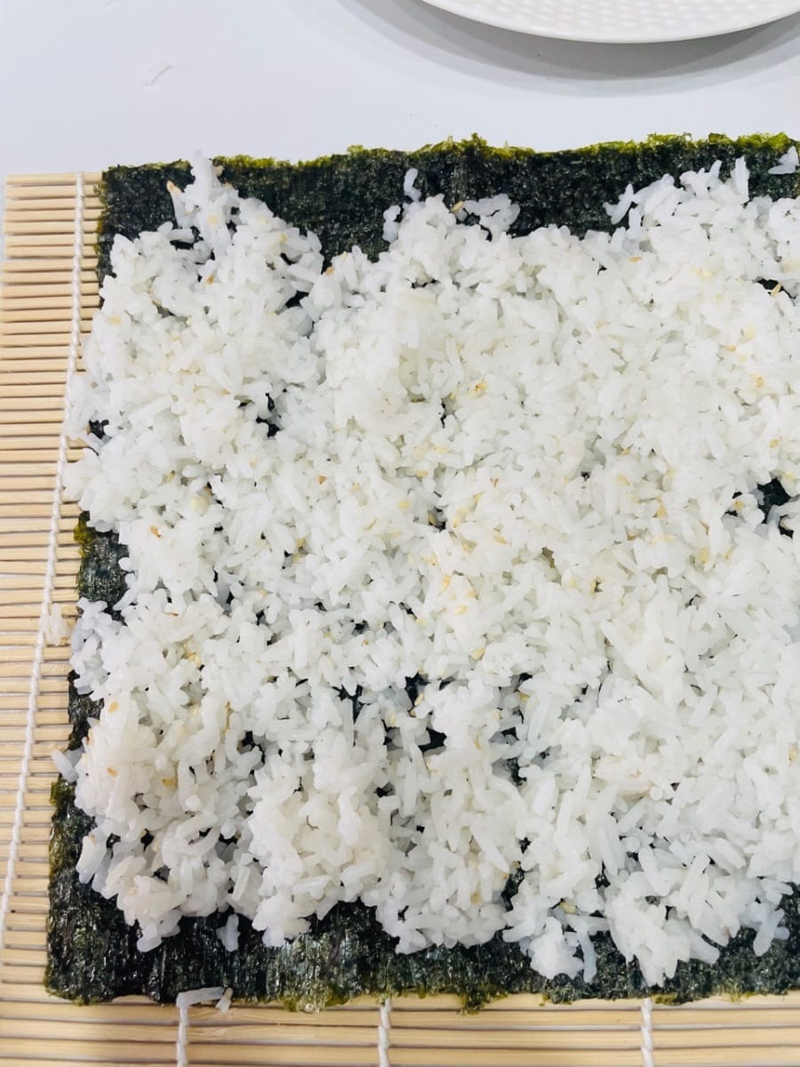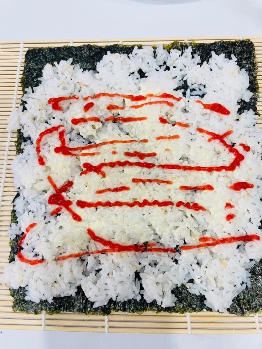 将卷帘平铺,紫菜光滑面朝下铺在卷帘上,均匀铺上拌好的米饭,用手轻压平整。挤上沙拉酱、千岛酱并抹匀,摆上蟹柳棒、蛋皮(或蛋丝)等食材。