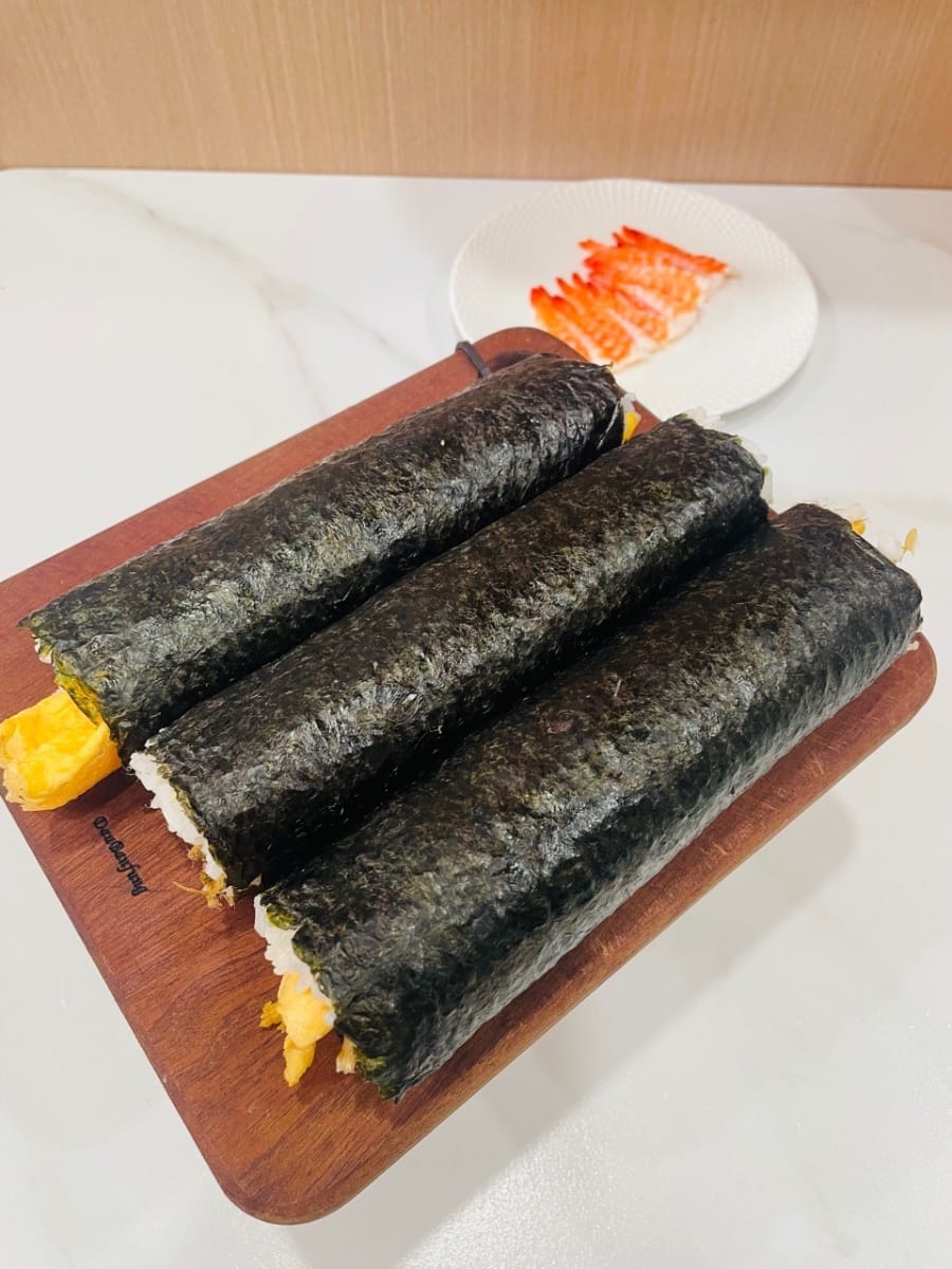 黑黢黢的海苔卷着白米饭,上头堆着粉嫩嫩的北极甜虾,虾尾红得透亮,跟刚蹦跶出水似的,往寿司上一搁,活像给米饭盖了层“鲜掉眉毛”的红被子。芝士片黄澄澄的,夹在虾和饭中间,看着就奶香四溢;肠仔、蟹柳藏在里头,光闻着那股肉香就忍不住咽口水!