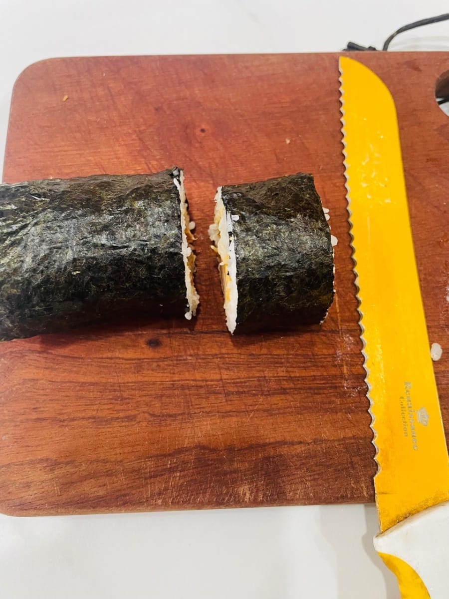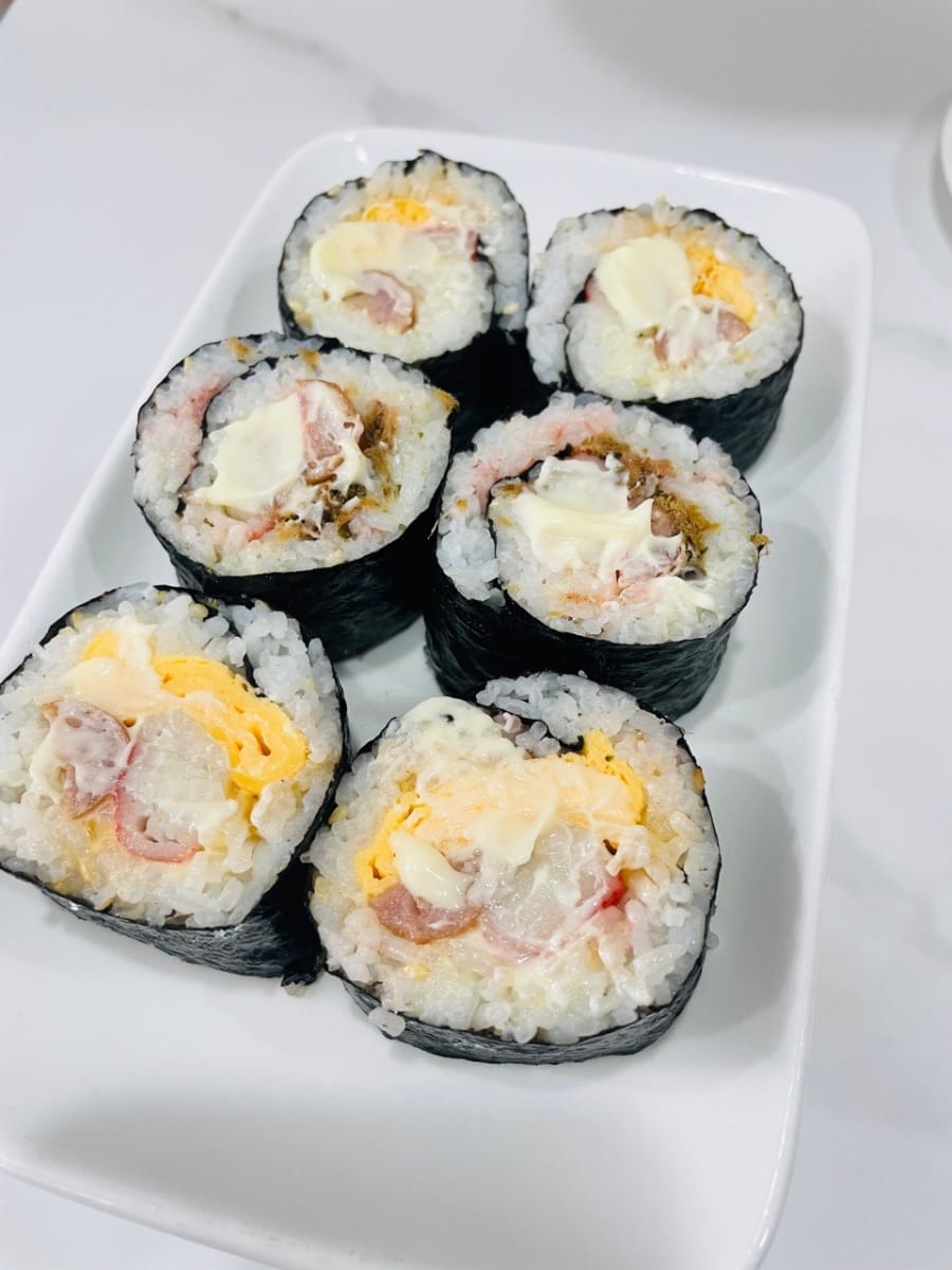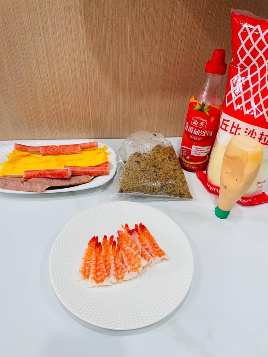 用锋利的刀将寿司卷切成小段,表面可再抹少许沙拉酱,方便粘合芝士片,再摆上甜虾。若有吞拿鱼、海草、鱼子等食材,也可随心添加。
