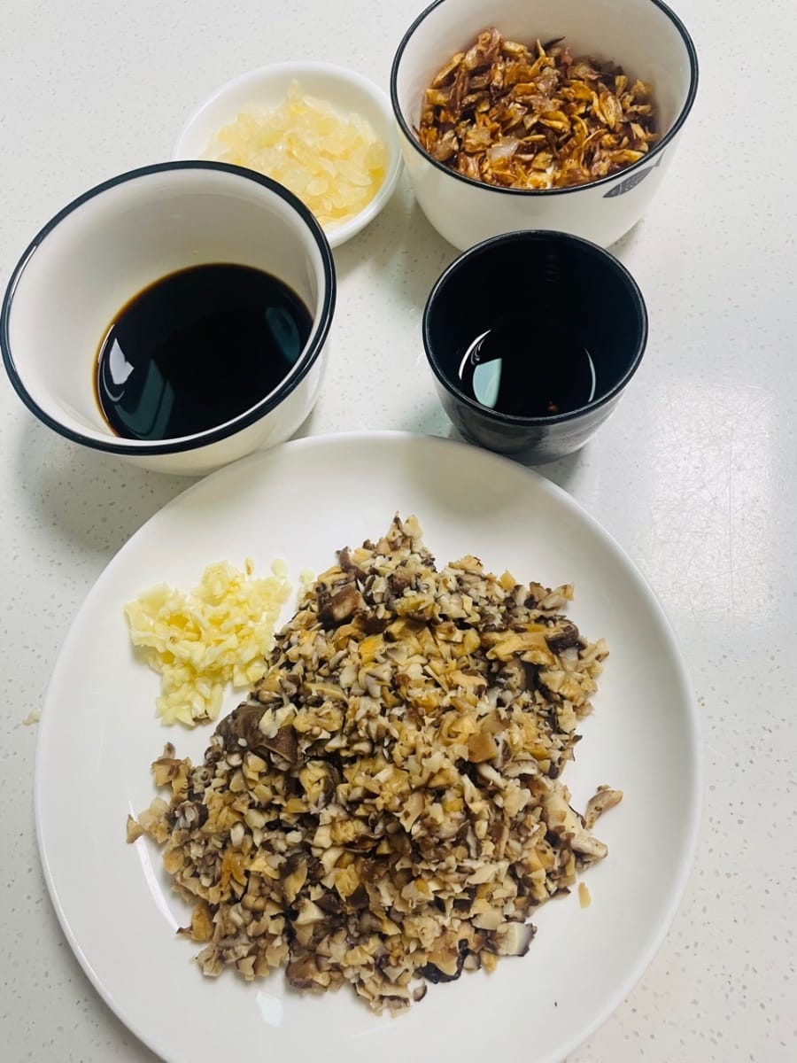 準備生抽、料酒、冬菇粒、蒜沫、蔥油酥備用。