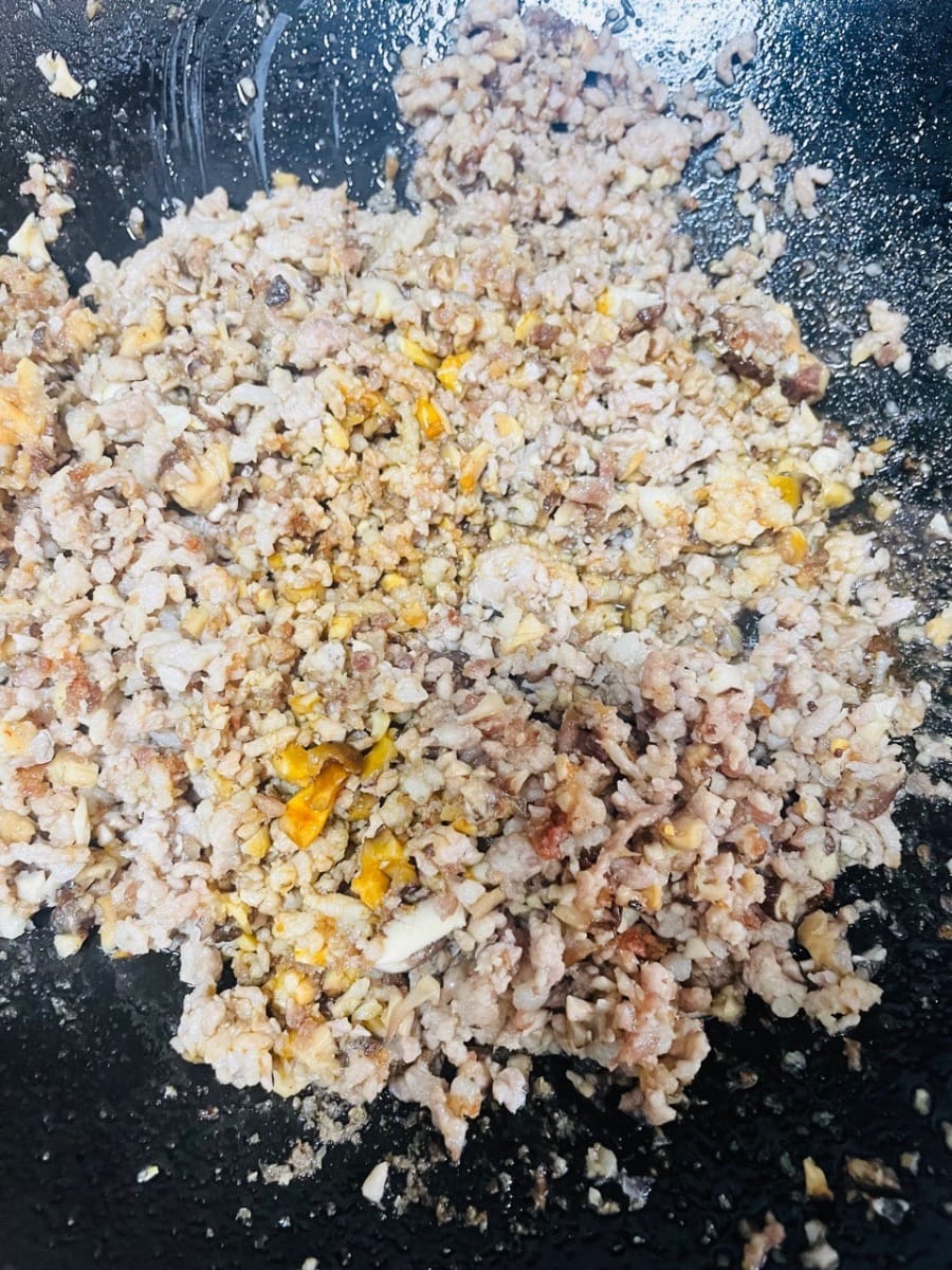 9. 下冬菇粒,白胡椒粉翻炒。