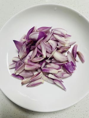 3. 紅蔥頭切薄。此時我眼淚汪汪,還以為是被自己的絕世廚神天賦感動到了,直到反應過嚟——原嚟是紅蔥辣的!哪裡是在出食譜,分明就是在挑戰人類淚腺控制力!不過等紅香油酥一出爐,香到我直接和紅蔥和解,這波屬於是“辣眼但值得”,含淚宣布:這份食譜,必須讓所有人饞哭!