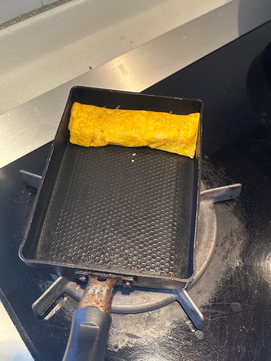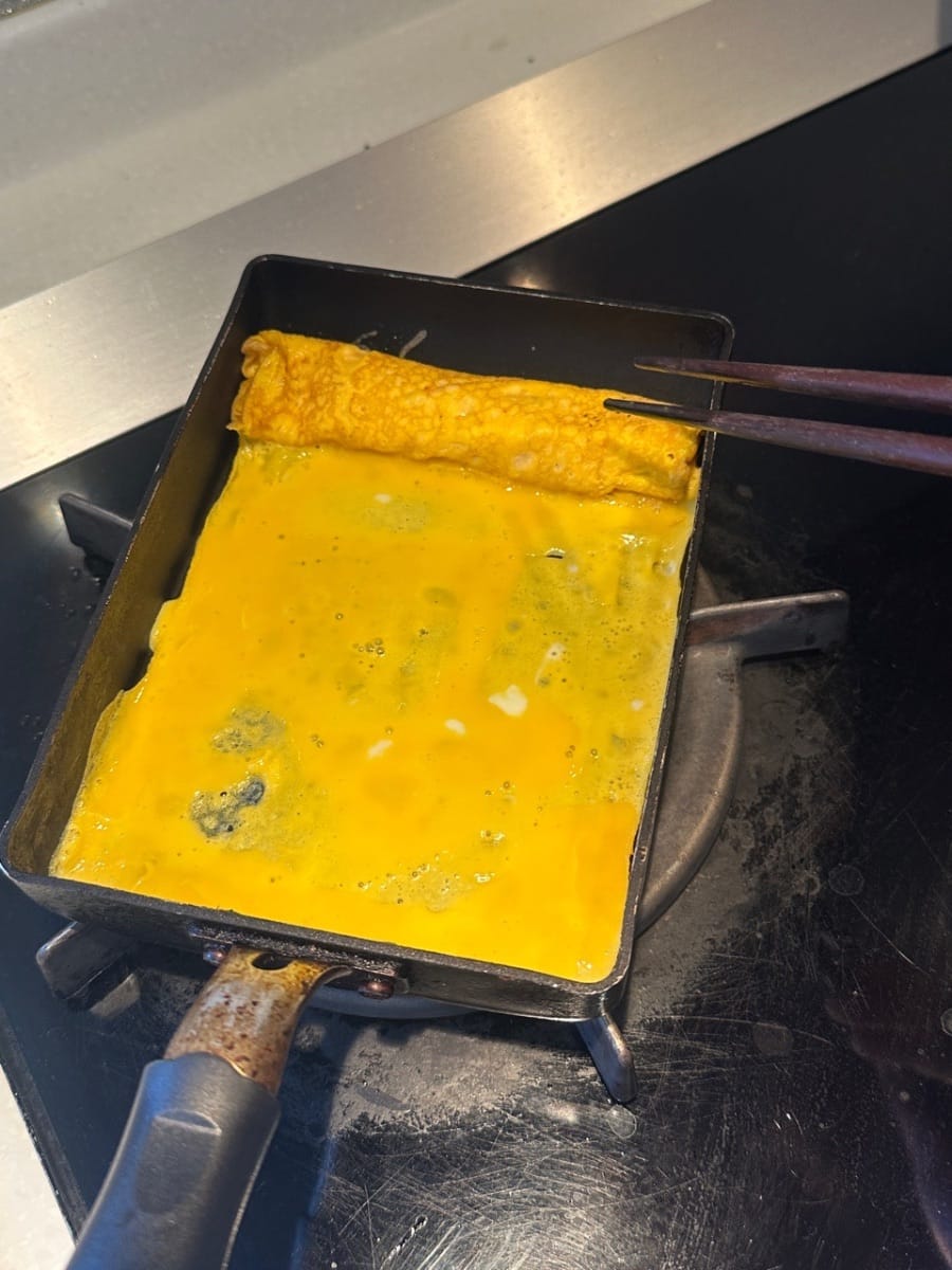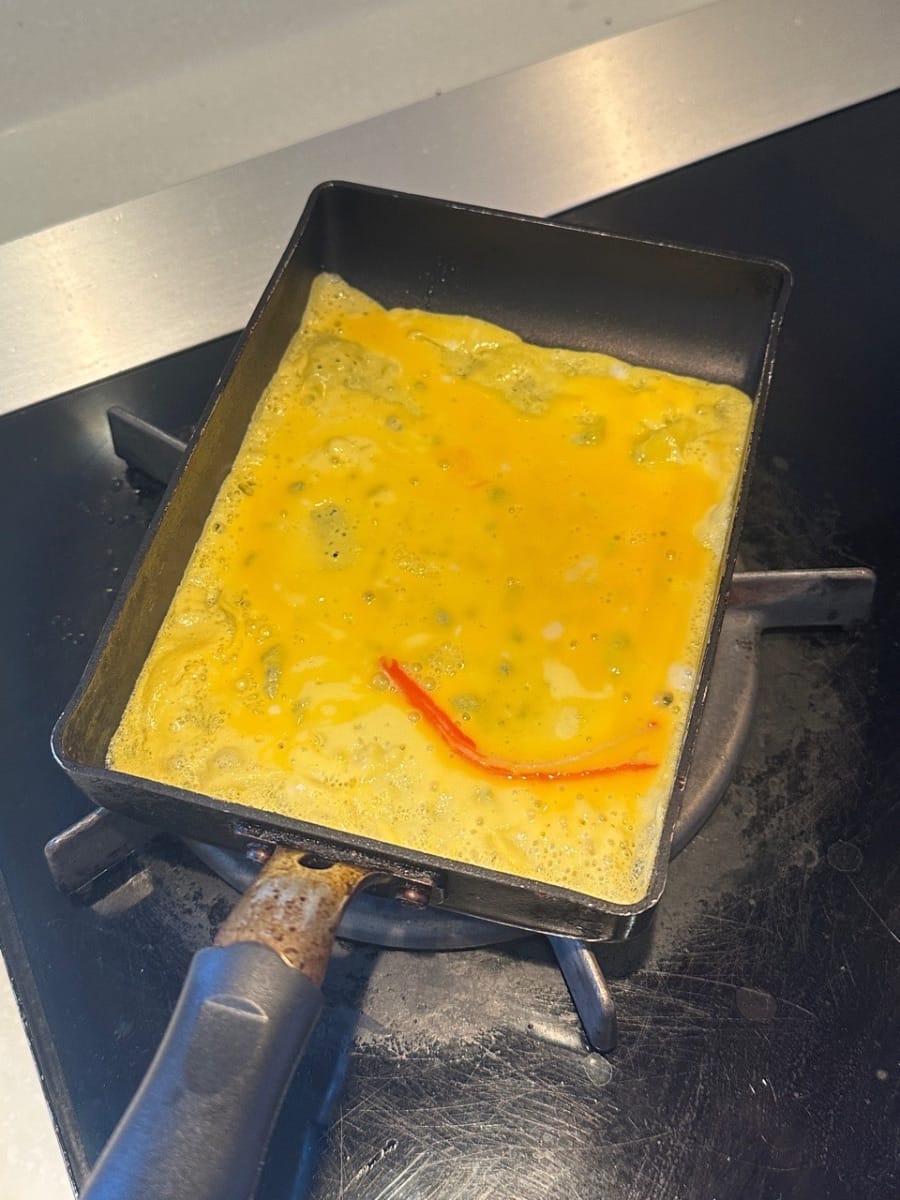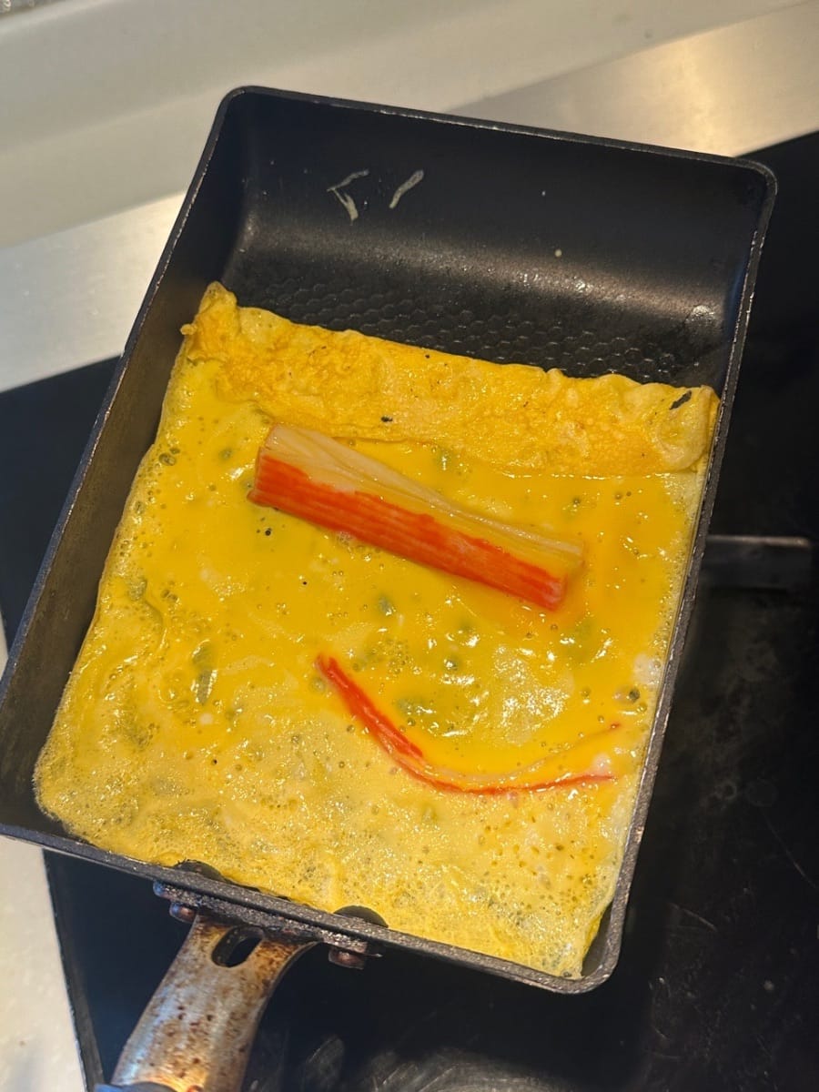 完成後,將折疊好的蛋捲推到頂部,再鋪上一層蛋液。如果喜歡,也可以在這裡加入芝士。