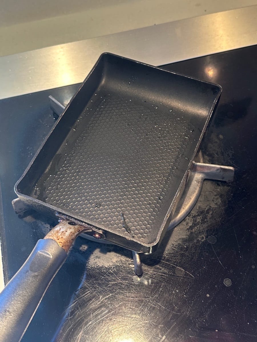 盡量使用如圖所示的矩形平底鍋。加入少許油,並用廚房紙巾均勻擦拭鍋底。